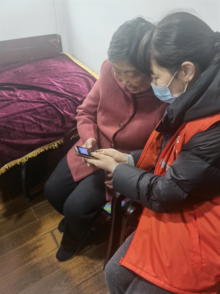 张阿姨今年78岁,是一名退休教师,喜欢学习新事物。家中子女给她买了一个智能手机,但没空教她。惠南镇北门居委团干部施瑜君来到张阿姨家中,手把手教她如何操作,还为她下载了老年群体在线教育APP,满足老人居家学习的需求。