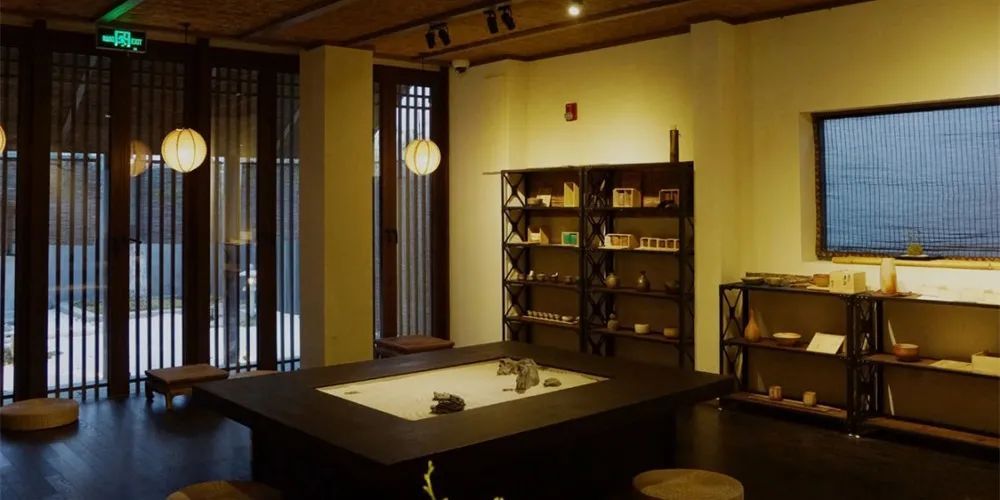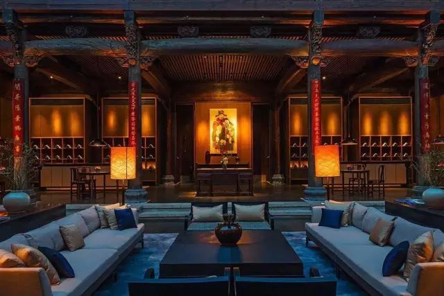 青灰色的石板地砖,搭配琥珀色挑高木梁,入口处气派的古朴屏风之下,一条涓涓细流从前厅蜿蜒至后院,整个空间禅意优雅,俨然一副旧时江南大户人家的模样。