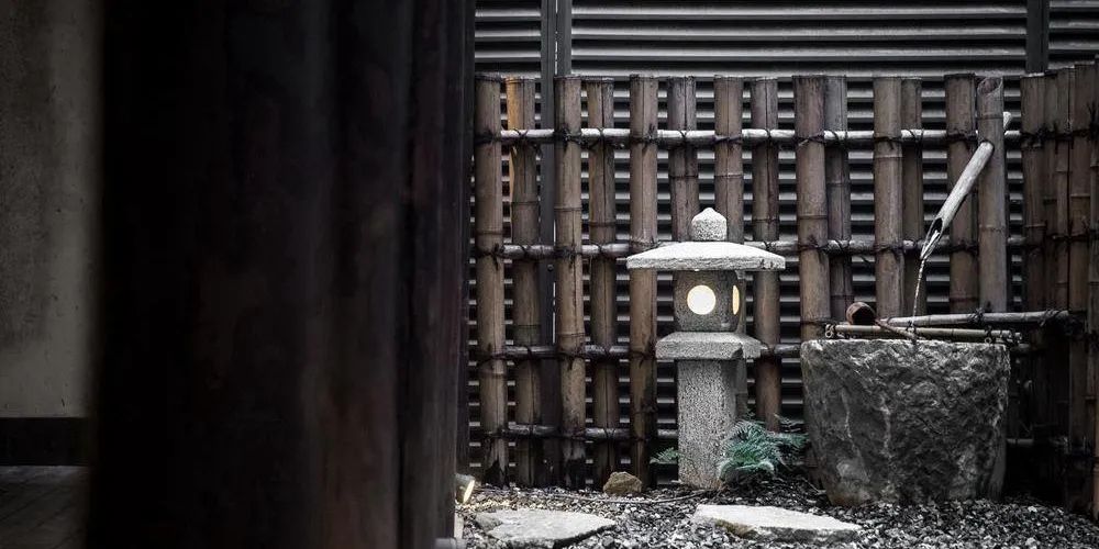 步入酒店,日式枯山水庭院随即映入眼前,洁白的砂砾,低矮的廊檐,竹编帷幔……非常简约冷静的Wabi-Sabi风跃然眼前。