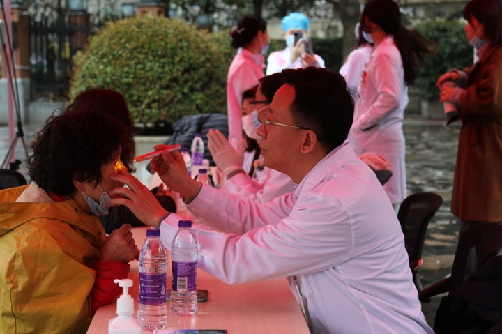 3月6日是第十四个世界青光眼日,上午9点30至11点,同济大学附属同济医院的8位眼科专家及护师们于同济医院宝隆广场举办了一年一度的青光眼医疗咨询活动,为前来就诊的市民们进行眼压测量、青光眼筛查、疾病咨询等。
