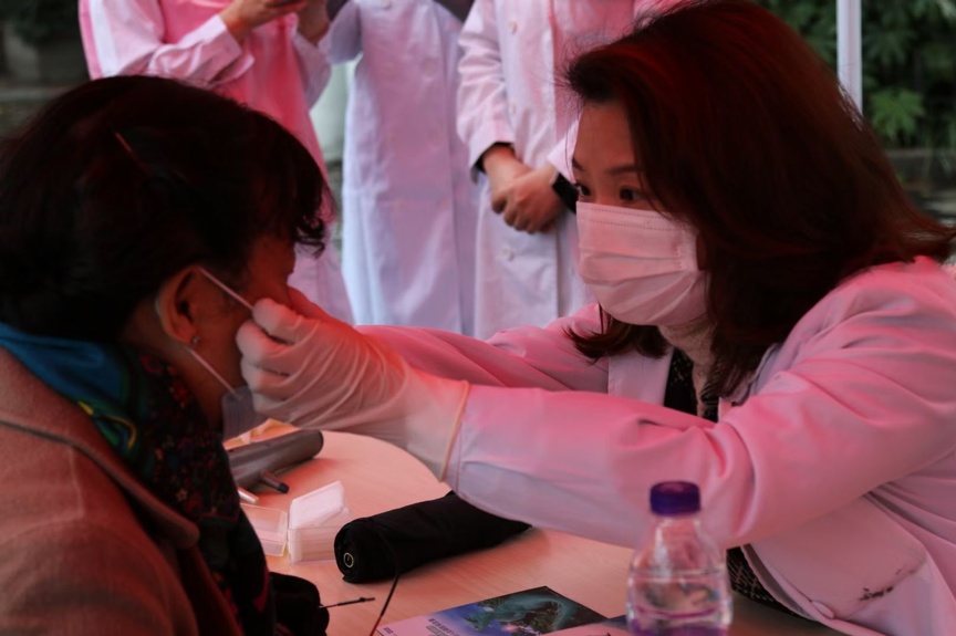 王震副主任医师(右二)和张力副主任医师(右一)为市民检查