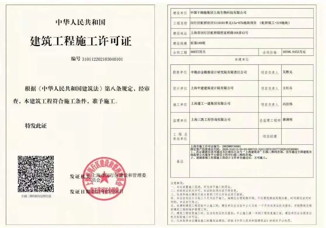 日前,中国干细胞集团有限公司的卢文潮从闵行区社会投资项目审批审查中心工作人员手中接过了“干细胞”项目的桩基施工许可证。