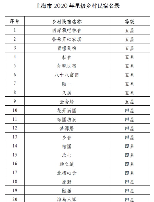你知道吗?2020年上海评选出了五星级乡村民宿9家,四星级乡村民宿18家,三星级乡村民宿13家。不妨周末带上家人去看满天繁星、听蛙叫鸟鸣,体验乡村民宿的独特魅力吧。