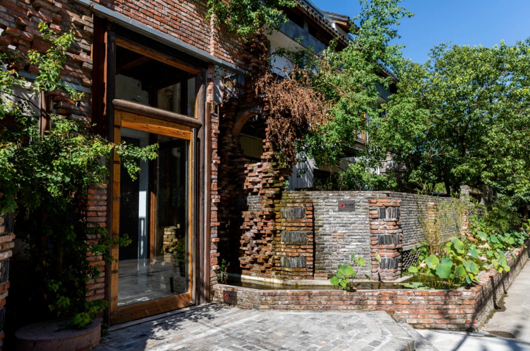 青檐民宿就藏在金山廊下的山塘村,是由上世纪的老厂房改造而来。外部整体以田园红砖风格为主,搭配青砖黑瓦,种植绿色植物,更显金山如画乡村田园好风光。民宿有14间客房,有双床房、大床房、复式大床房、家庭套房、庭院房,可供不同需求的游客选择。民宿里多以木质家具为主,还摆放着许多老物件。这些老物件有了岁月的痕迹,在灰黄灯光的照亮下,每一样都足以勾起儿时的回忆。