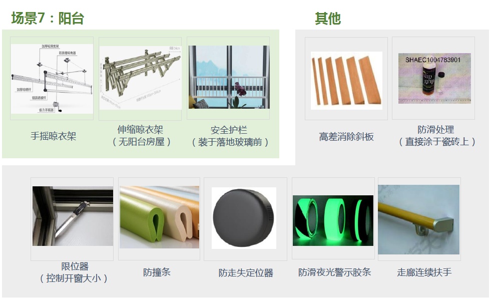进入补贴范围内的适老化改造服务与产品,按玄关、卫生间、厨房、客厅、卧室、阳台、过道七大生活场景进行分类,共计60余项产品与服务供选择,基本覆盖了老年人居家生活的方方面面,各种需要支持的生活情境基本都能满足。
