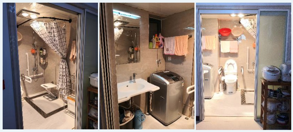 ②拆除淋浴房,设置无障碍淋浴区,方便护理老人洗浴。