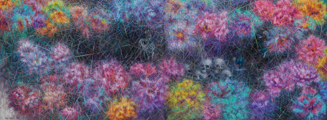 李建华运用他独创的稻草飞线技法,将绘画中的图像景观并置,用独到的提纯来实现主观化的图像再建,让艺术创作的审美对象同时成为思考的对象: