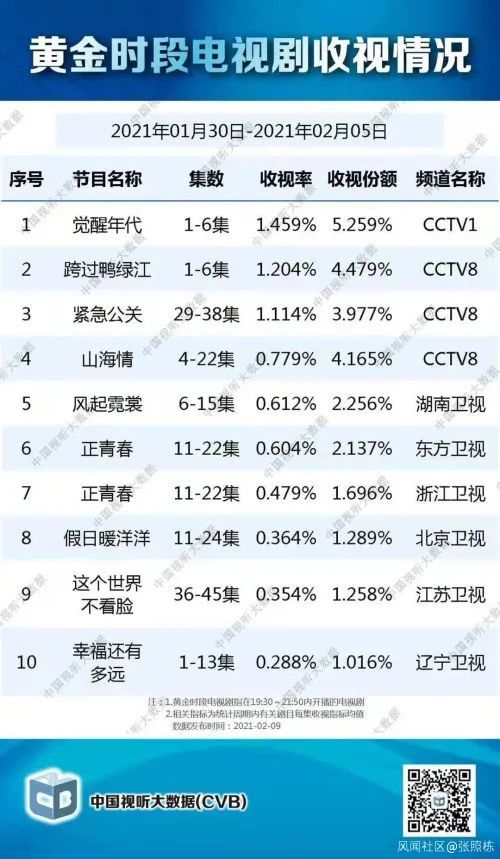据“中国视听大数据”(CVB)统计,1月30日至2月5日期间,《觉醒年代》一开播,就领跑各大卫视黄金时段电视剧收视率榜单。