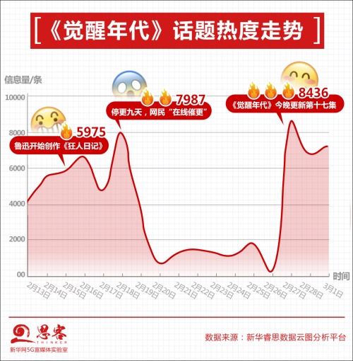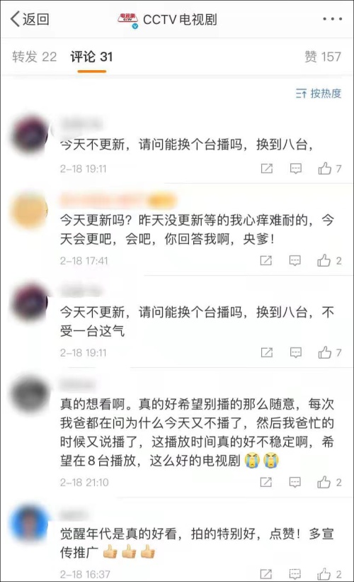 2月18日,《觉醒年代》因春节排播停更,网友疯狂催更;