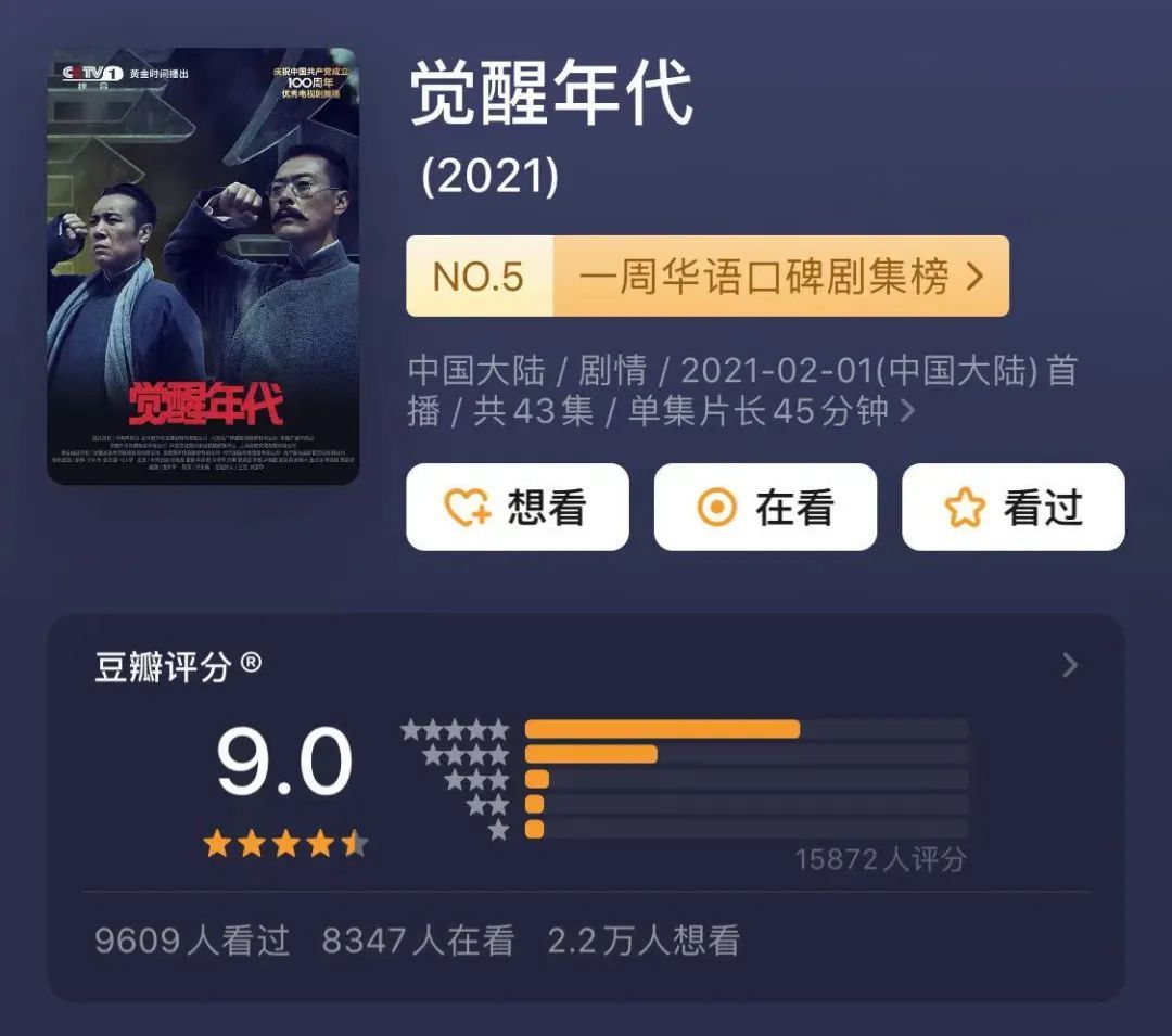 截至3月12日,《觉醒年代》的豆瓣评分已经从开播时的8.3分涨到了9.0分。超过1万5千人为这部剧打分,超6成网民给出五星好评。