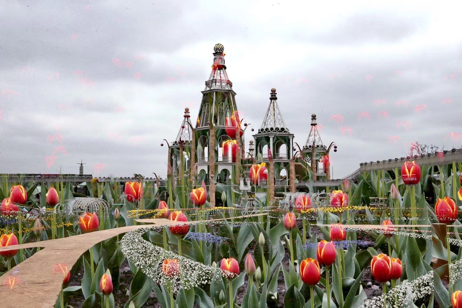 在园艺大师的精心雕琢下,奇迹花园里每个角落都可与大自然的美好和谐统一,除了奇迹花毯主景点,花园主干道、漫花堤等沿路播种了各类品种的郁金香,还有珍贵的重瓣、饰边郁金香、百合花型郁金香、黑郁金香……