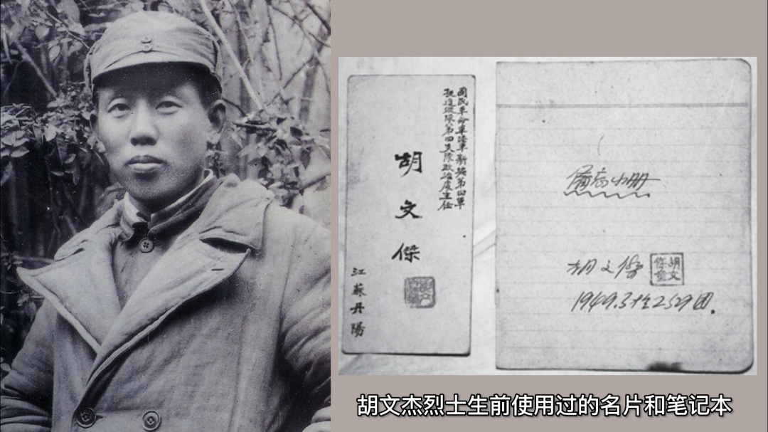 “国民革命军陆军新编第四军挺进纵队第四支队政治处主任胡文杰江苏丹阳”,这张已经泛黄的名片,是战争年代的珍贵文物,胡文杰烈士的遗孀唐渠把它作为家庭珍藏,已保存了70多年。1943年8月,时任新四军苏中三分区靖江独立团政治处主任的胡文杰,在参加靖西三元桥反敌伪袭击战中负伤,被送到后方野战医院——苏中三分区卫生部靖江休养所养伤治病。当时唐渠任靖江休养所的副所长,胡文杰在养伤治病时认识了唐渠,于是给了唐渠这张名片。这张名片,记录着胡文杰、唐渠的一段感情经历,是他们俩的爱情“信物”。