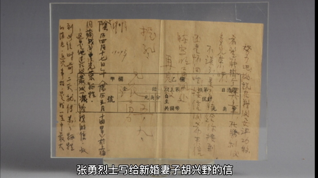 1949年5月9日,参加解放上海战役前三天,张勇给新婚才2个月的妻子兴野写信。信中写道:“要到上海去了!一切为了胜利。希你努力工作,在支部中很好动员,展开组织活动,使每个同志都紧张起来。我也如此。最后的战斗我坚信一定胜利的,但也是艰苦残酷的,我却不怕。我将愿贡献我的一切给这一战斗,为了永久的和平与幸福。努力吧!”写信后的第5天(5月14日),张勇牺牲在解放上海的战场上。她的妻子在得到丈夫牺牲消息后的2天,才收到此信。妻子胡兴野接到遗信后,在空自处与下了一段备注:1949年阴历四月十七日午(阳历5月14日午)于上海月浦战斗中光荣牺牲。