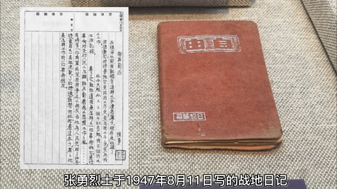 1947年8月11日,张勇在日记本“写在前面”中写道:“在很早以前我就想有这样一本漂亮簿子,现在是如愿了。我很爱它,我将要它变成我的历史,变为我的斗争,变为我的工作。从今天起,从战斗动员起,我开始我的革命,对党对人民的忠诚,能反映着我的思想、工作、作风。我将有一个希望,希望在我旁边的战友,当他为人民完成了任务时,最后的一点血流干了的时候,能替他收拾着这本子,看看他是怎样工作的一个革命战友。”
