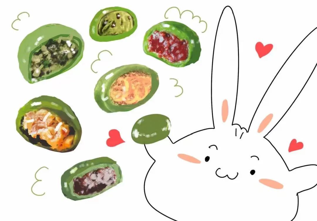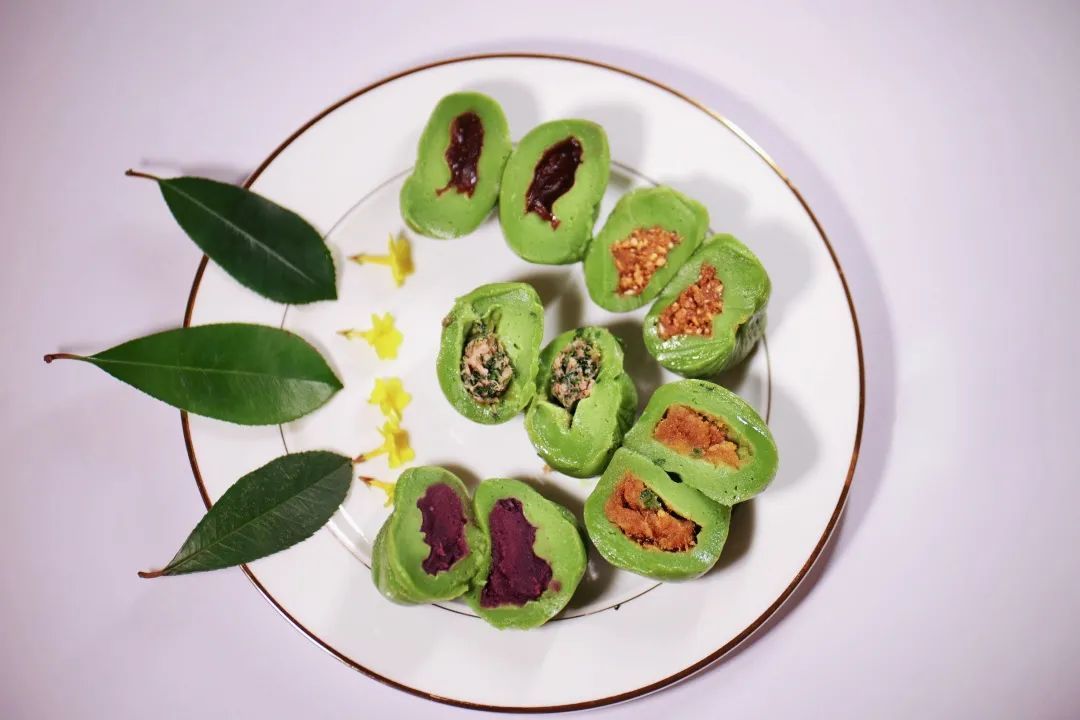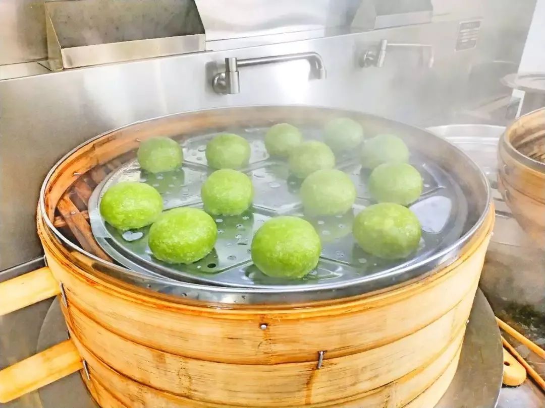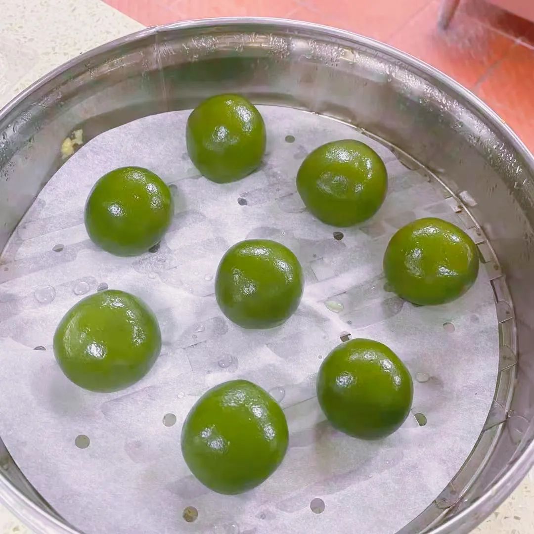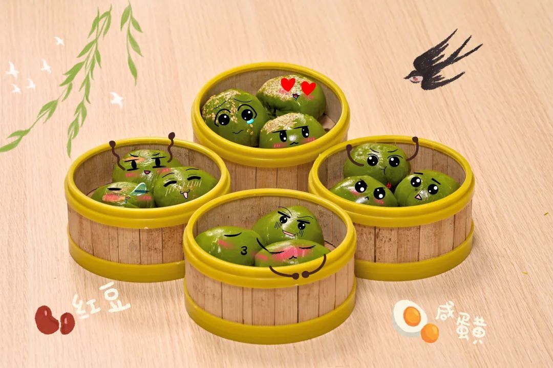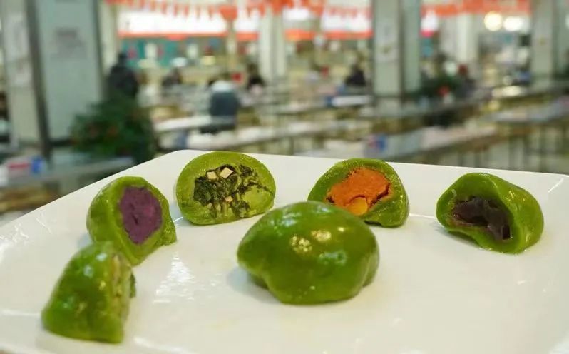 艾草汁拌进糯米粉,加上传统或是创新的馅料,在食堂师傅的揉捏下形成了一个个软软糯糯、油润如玉的青团。配上豆沙、巧克力之类的甜馅,一口下去,甜意从唇齿一路弥漫到心间;配上腌笃鲜、咸蛋黄肉松之类的咸馅,则会让人忍不住吃了一个又一个。