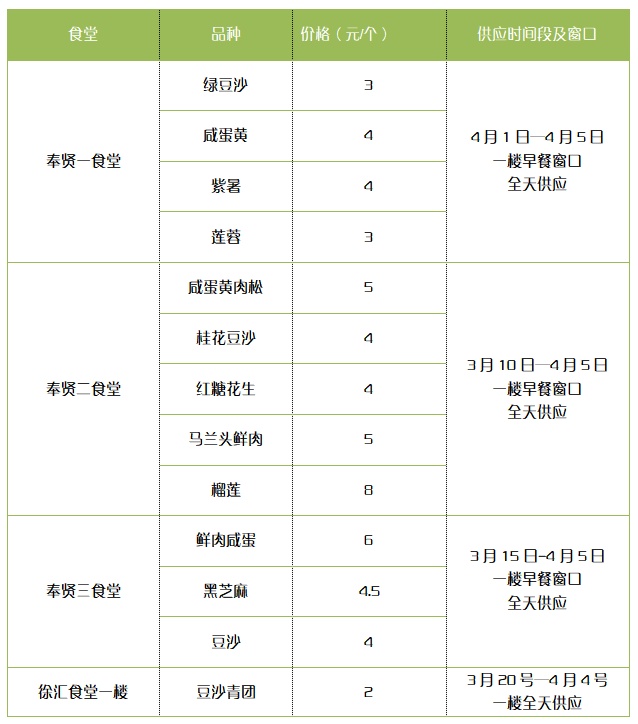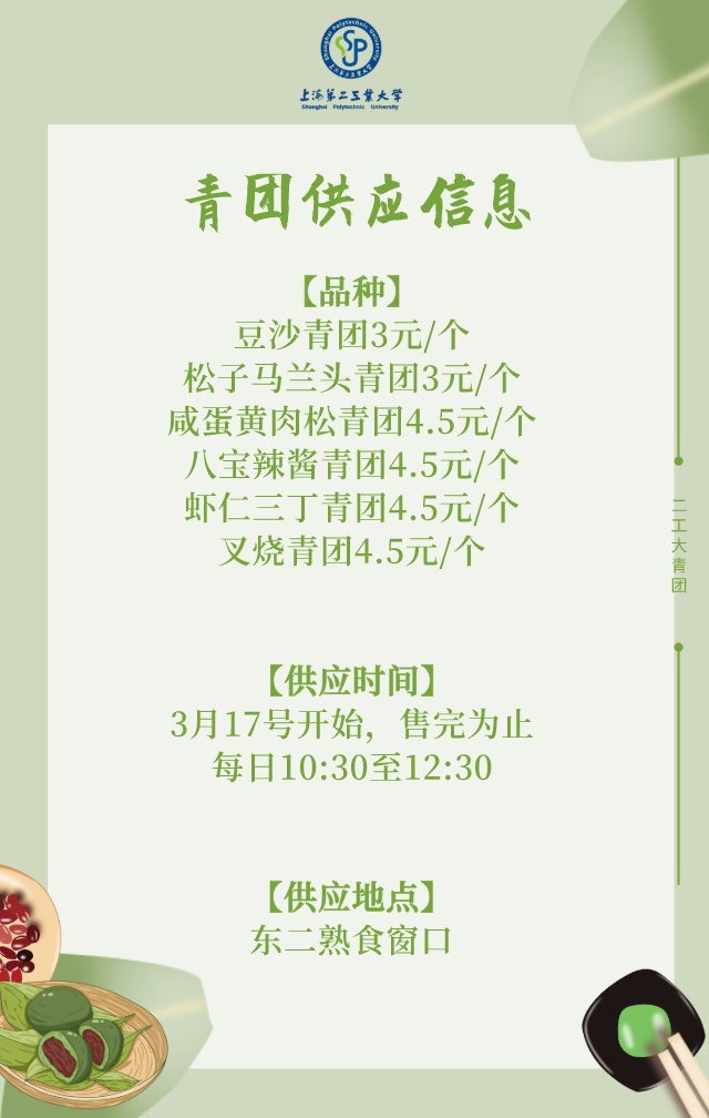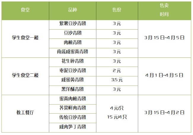 上海交通大学后勤餐饮部门将在3月中下旬起在闵行、徐汇等校区各餐厅专窗供应青团,除了传统的本帮豆沙青团和经典黑洋酥青团,还有咸蛋黄肉松、麻香花生碎、红枣葡萄干核桃仁青团等数个品种,青团供应将持续到清明节后,学校还将组织师生共同参与包青团互动活动。