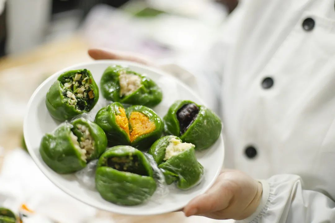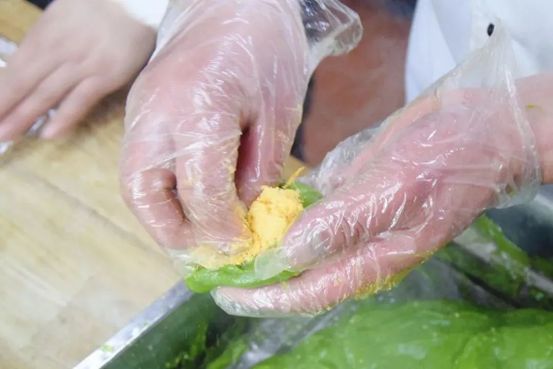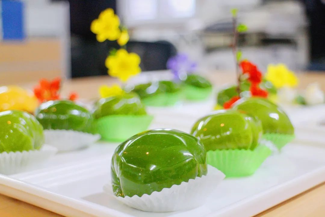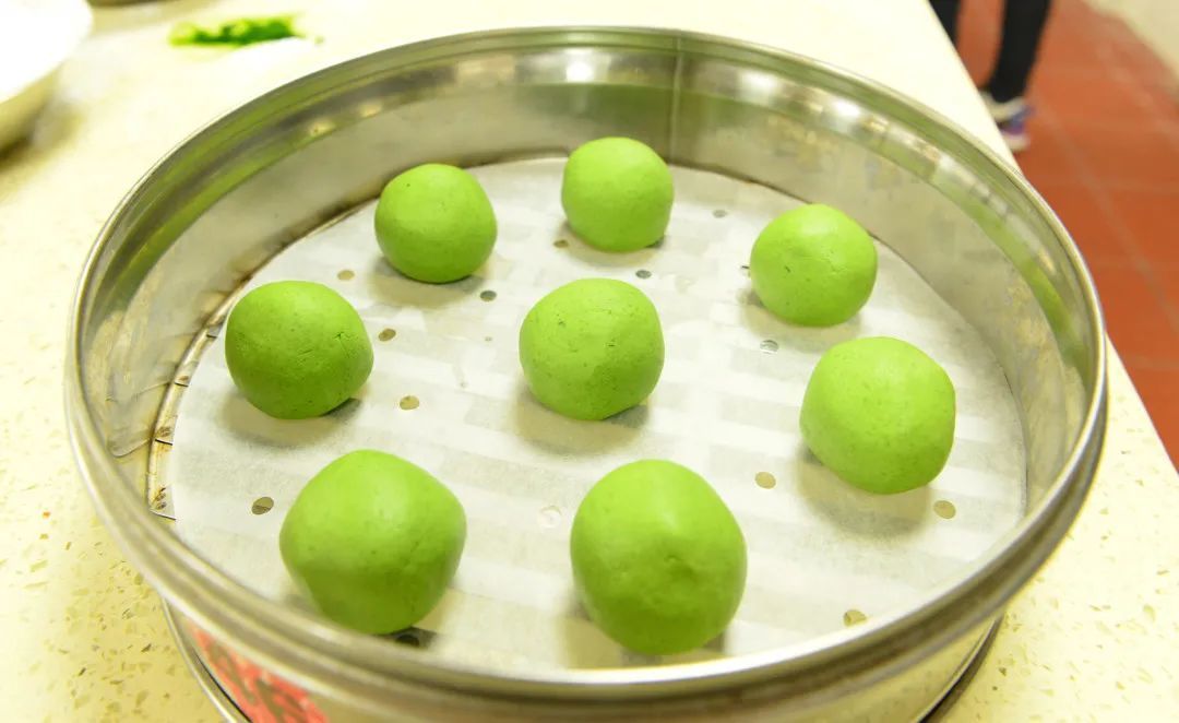 制作青团是学校酒店烹饪学院烹调工艺与营养专业的实训课程,由糯米粉、澄粉、豆沙馅等原料制作而成,色如碧玉,口感糯软。