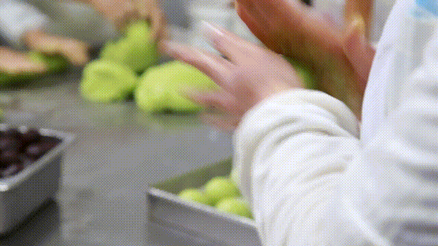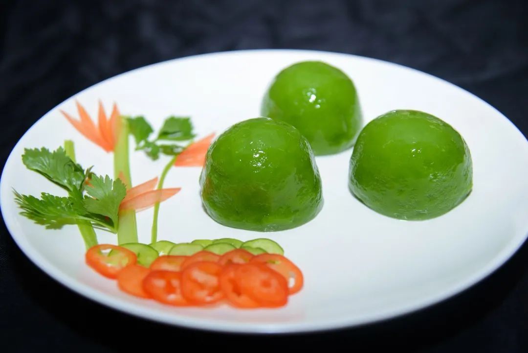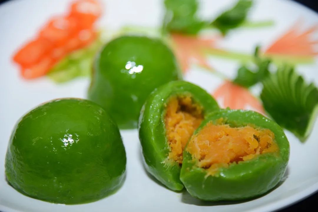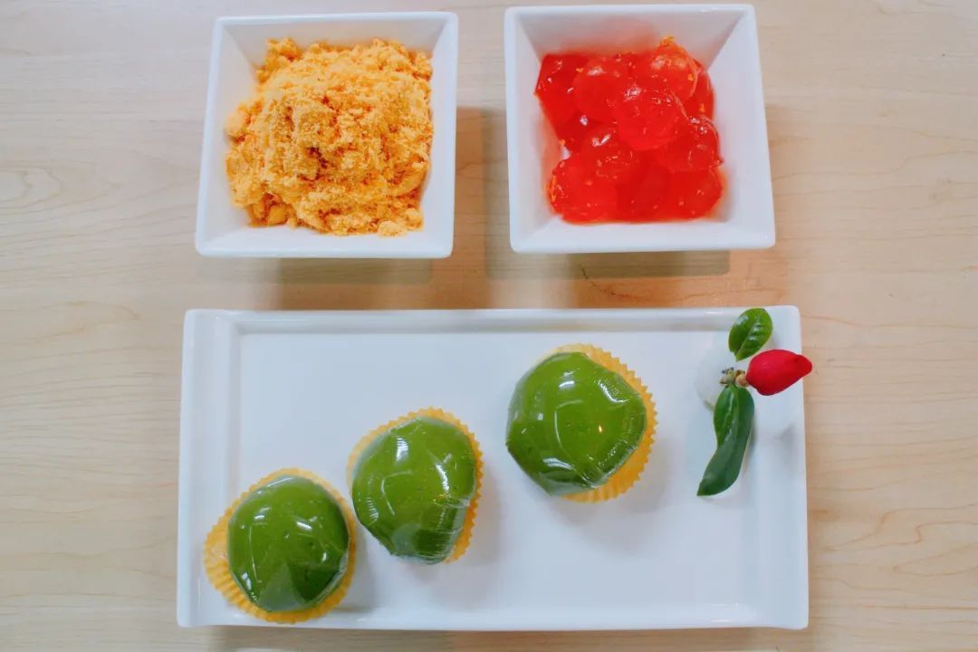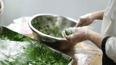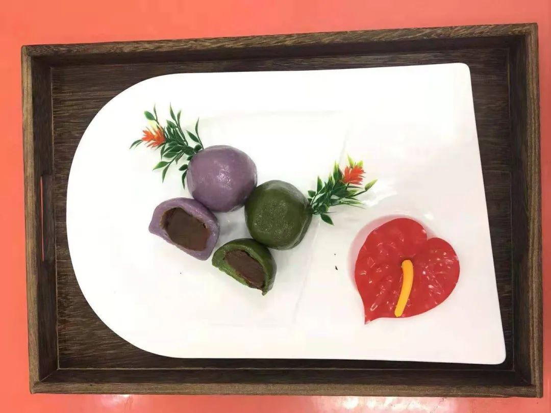 制作青团是学校酒店烹饪学院烹调工艺与营养专业的实训课程,由糯米粉、澄粉、豆沙馅等原料制作而成,色如碧玉,口感糯软。