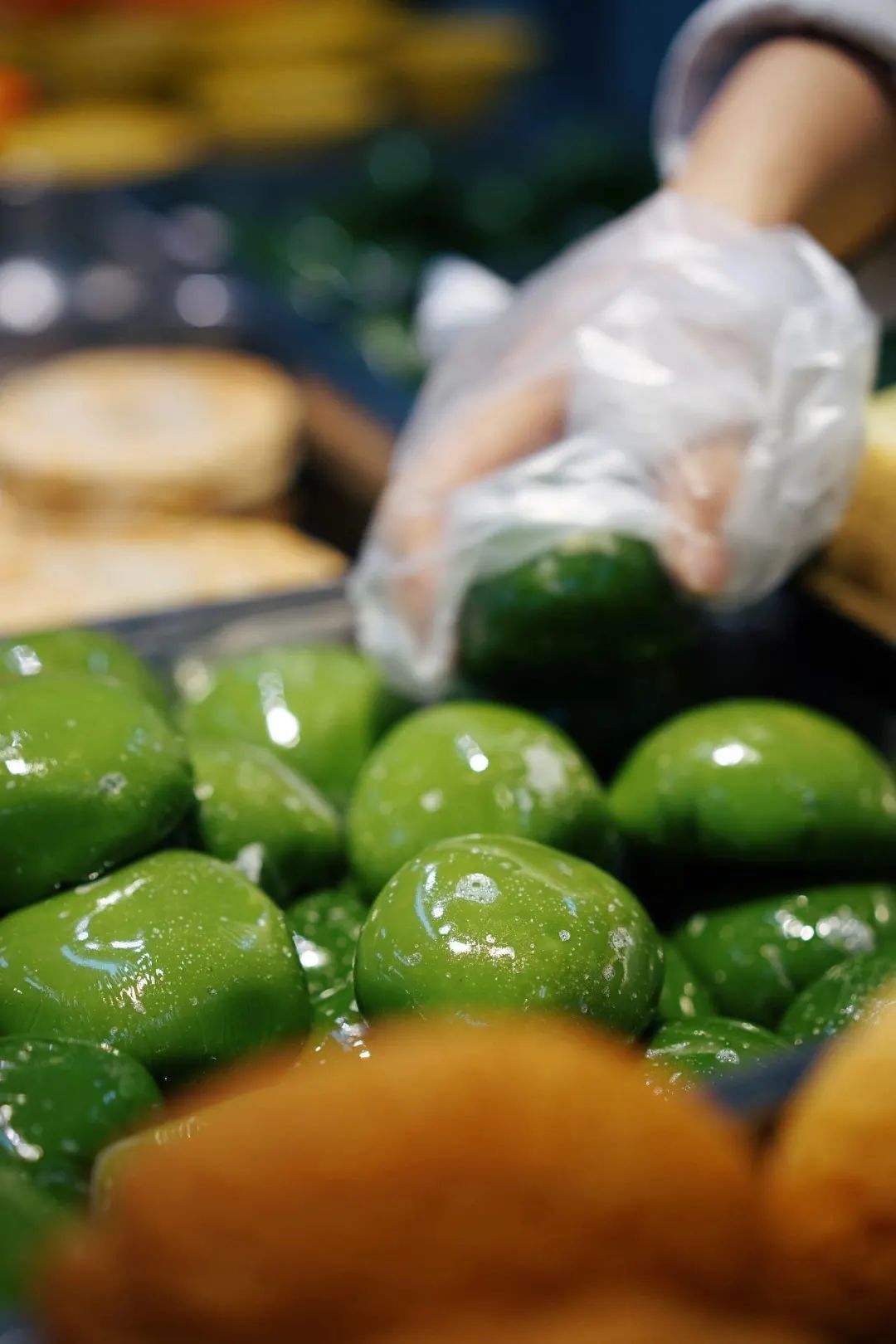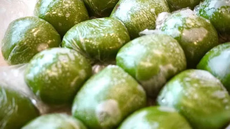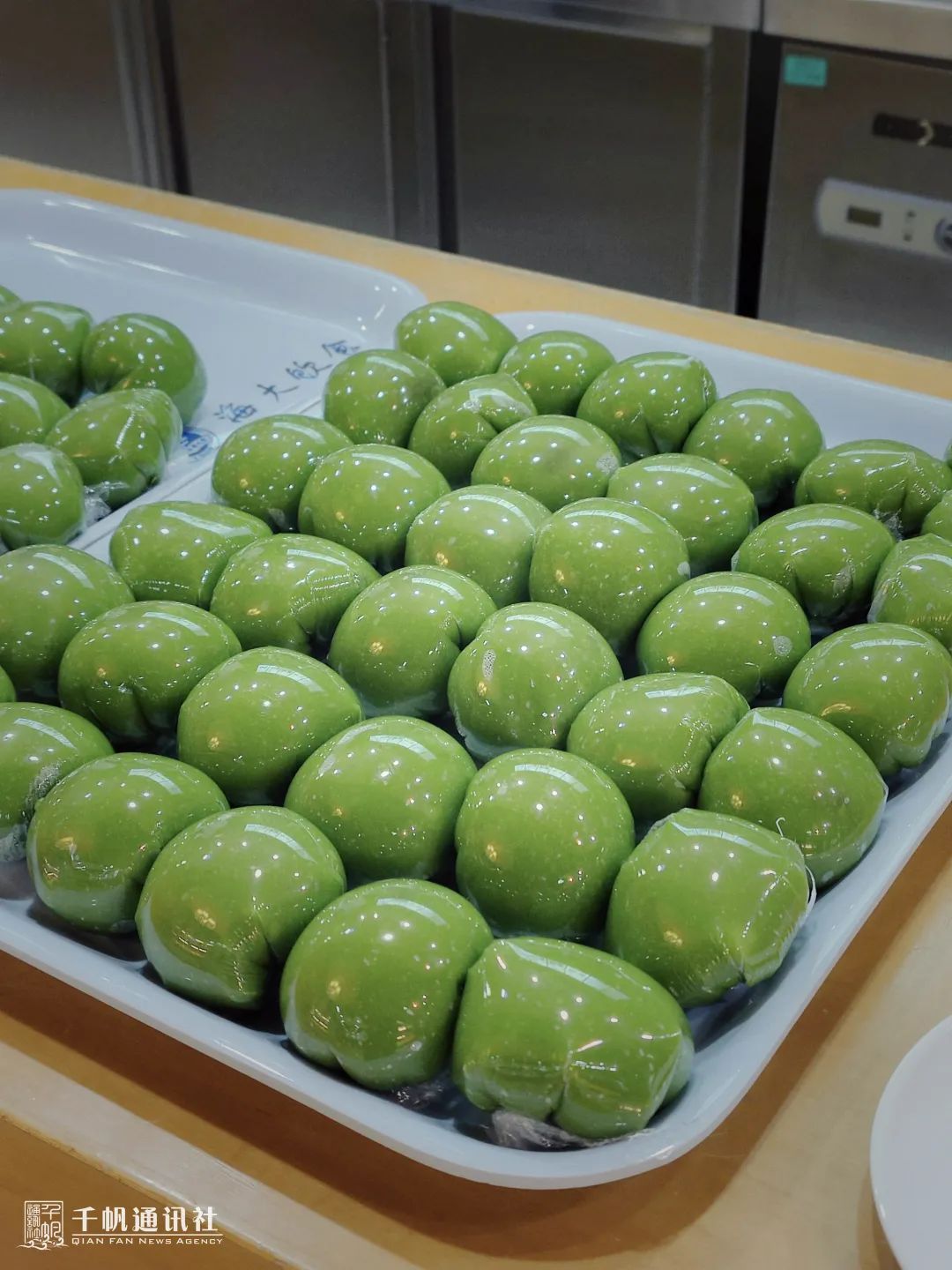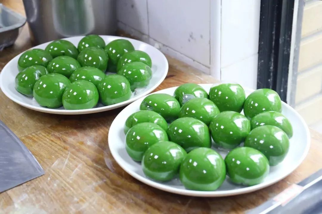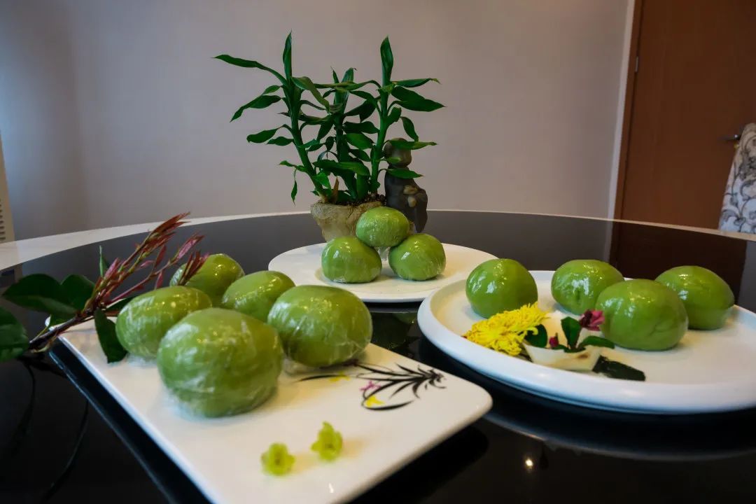 包装起来的青团整齐地排放在盘里,油润饱满,青翠欲滴。