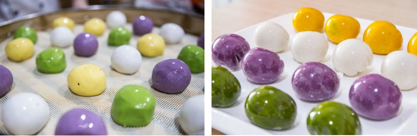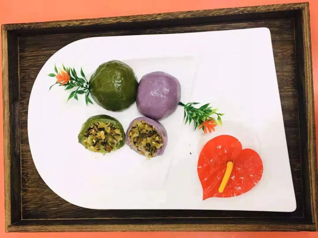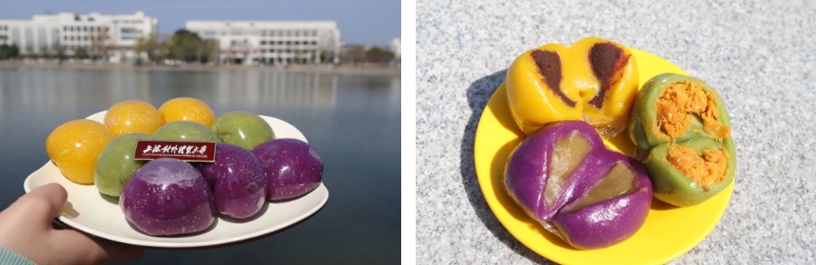 华东理工大学将在多个食堂供应品种丰富、炫丽多彩的手工青团:青色(芹汁面皮,芝麻豆沙馅或蛋黄肉松馅)、黄色(南瓜面皮,芹菜鲜肉馅或香芋馅)、红色(火龙果面皮,奶黄馅)、紫色(紫薯面皮,芝麻豆沙馅)。