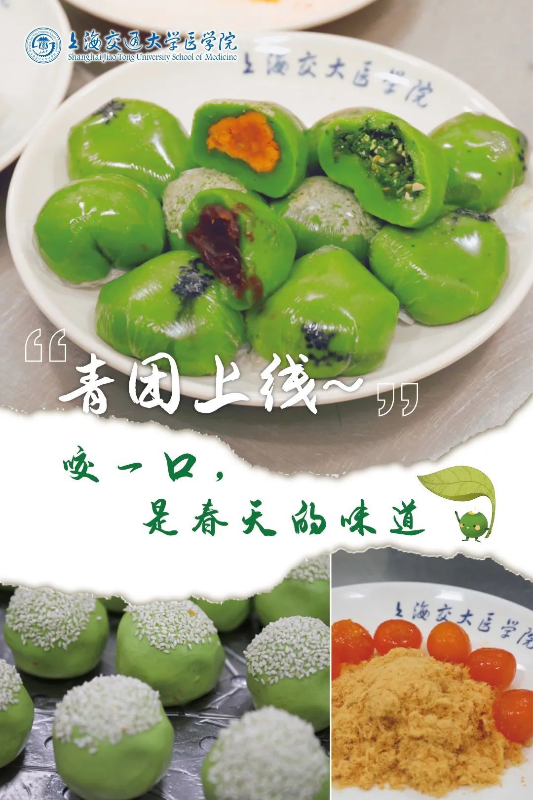 一口青团,齿颊留香。最受上海交通大学医学院师生欢迎的还是马兰头青团、咸蛋黄肉松青团、豆沙青团等经典口味。