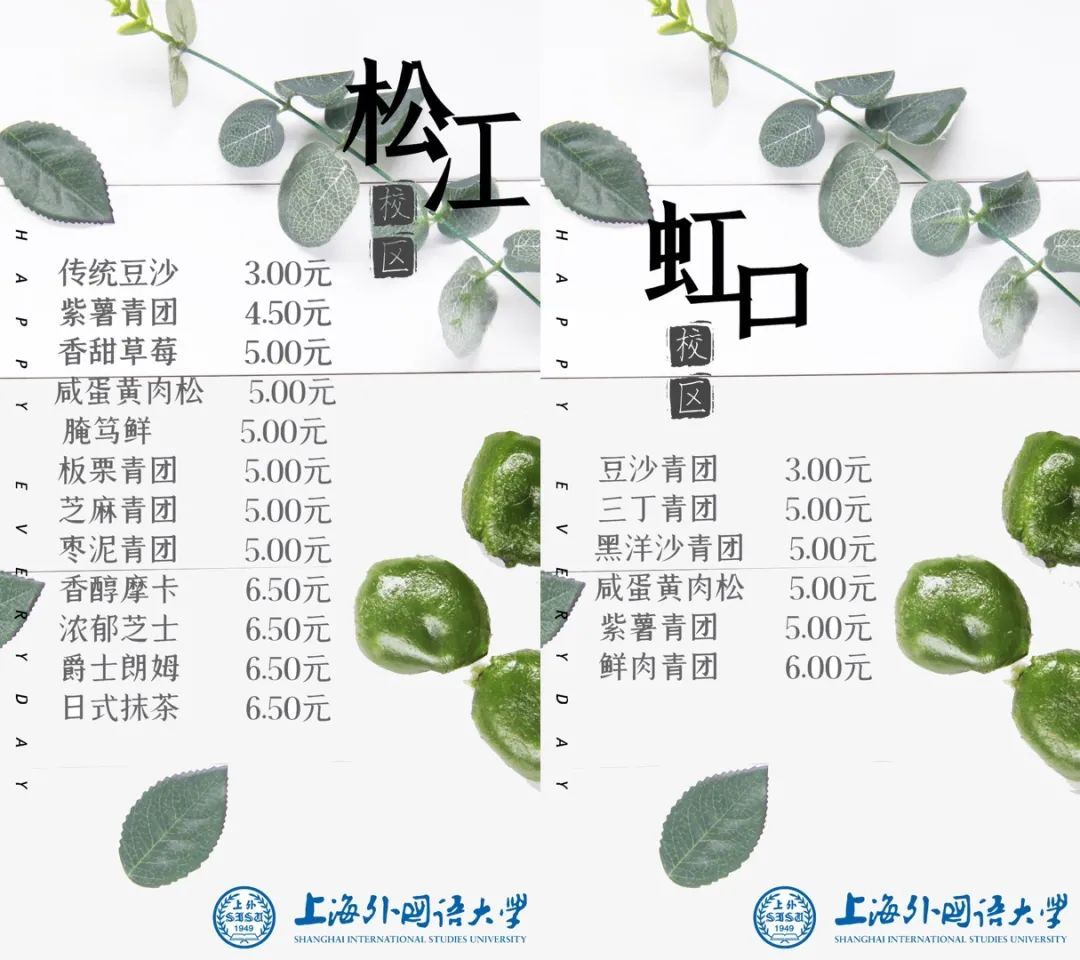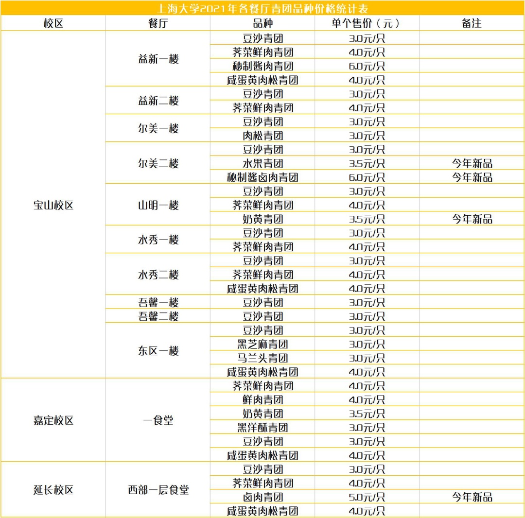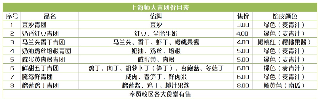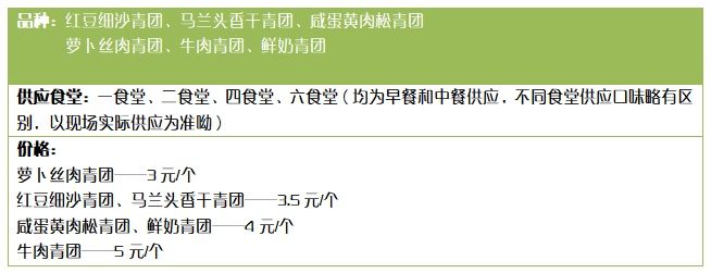 今年,上海理工大学在早餐和午餐时间段进行青团供应,除传统红豆细沙青团、马兰头香干青团、咸蛋黄肉松青团等口味,还创新推出萝卜丝肉青团、牛肉青团、鲜奶青团供广大学子选择购买,青团单价根据口味不同为3元/个—5元/个。