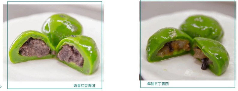 豆沙青团内是甜蜜的红豆沙;肉松青团是酥软鲜香的黄金肉松口味;咸蛋黄青团每一个都含有一整个咸蛋黄,口感鲜醇,好吃而不腻;马兰头青团咸鲜可口!