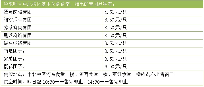 上海海事大学食堂推出青团啦,有蛋黄肉松、红豆沙、莲蓉、蜜豆、奶黄等多种口味的青团供师生挑选,价格实惠,3元、4元、5元一只不等,快去品尝吧!