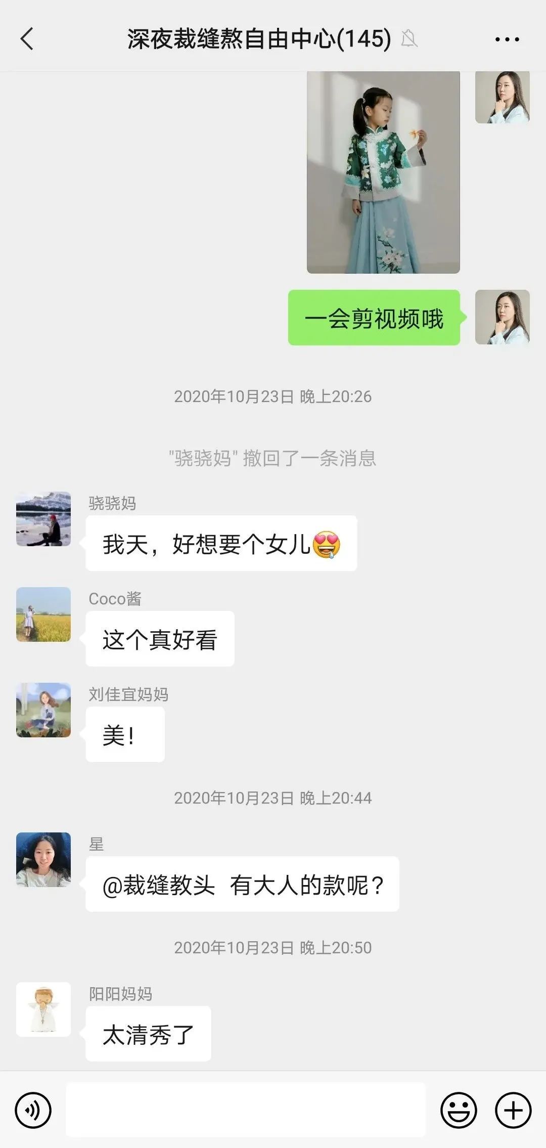“深夜裁缝熬自由中心”是赵永会建的一个微信群,用来和她的“学生”交流制作过程和心得。说起这个名字的由来,赵永会笑着说,“因为常常在晚间才有空缝制衣服,而且对于妈妈们来说,做衣服的时光不是熬夜,而是一种摆脱了工作、琐事、家务后放松的自由,我们乐在其中。”