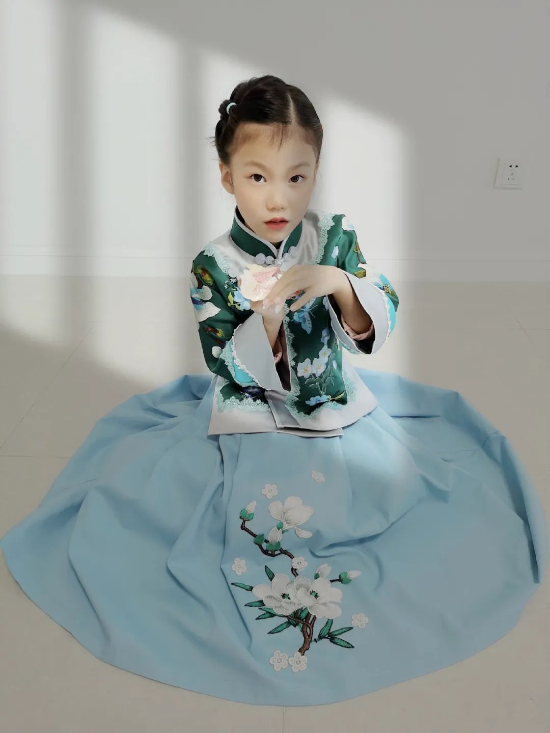 对赵永会来说,每一套古装服饰里都藏着一个温暖的故事。女儿小时候特别喜欢家里养的一只蓝色虎皮鹦鹉,于是赵永会便给女儿制作了一件绣有这只鹦鹉图案的棉马甲,让女儿爱不释手;去年上半年疫情防控期间一直宅在家,女儿有点垂头丧气,赵永会又根据白鹤南翔的传说,做了一款有白鹤刺绣图案的袄裙,寓意孩子能一飞冲天。