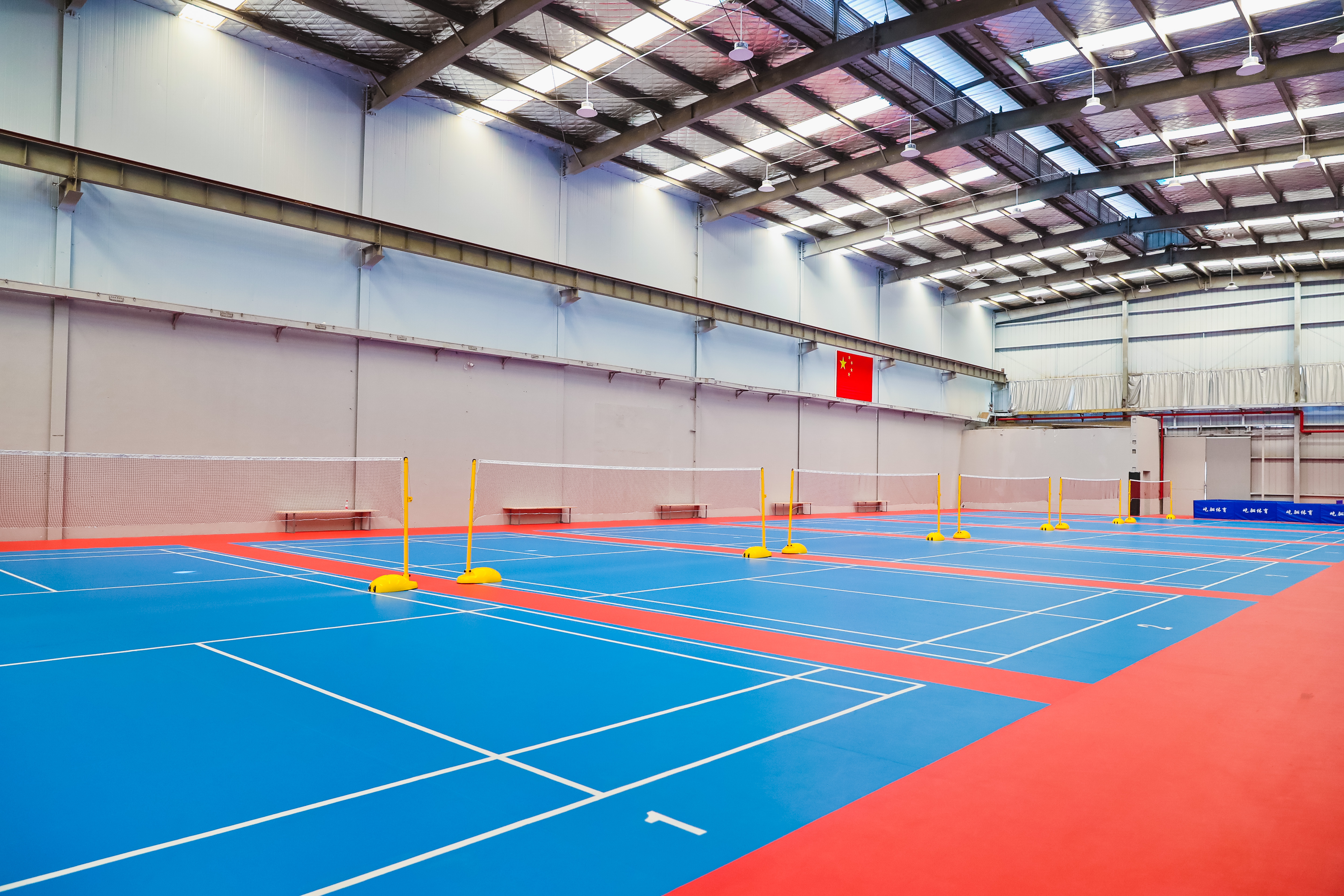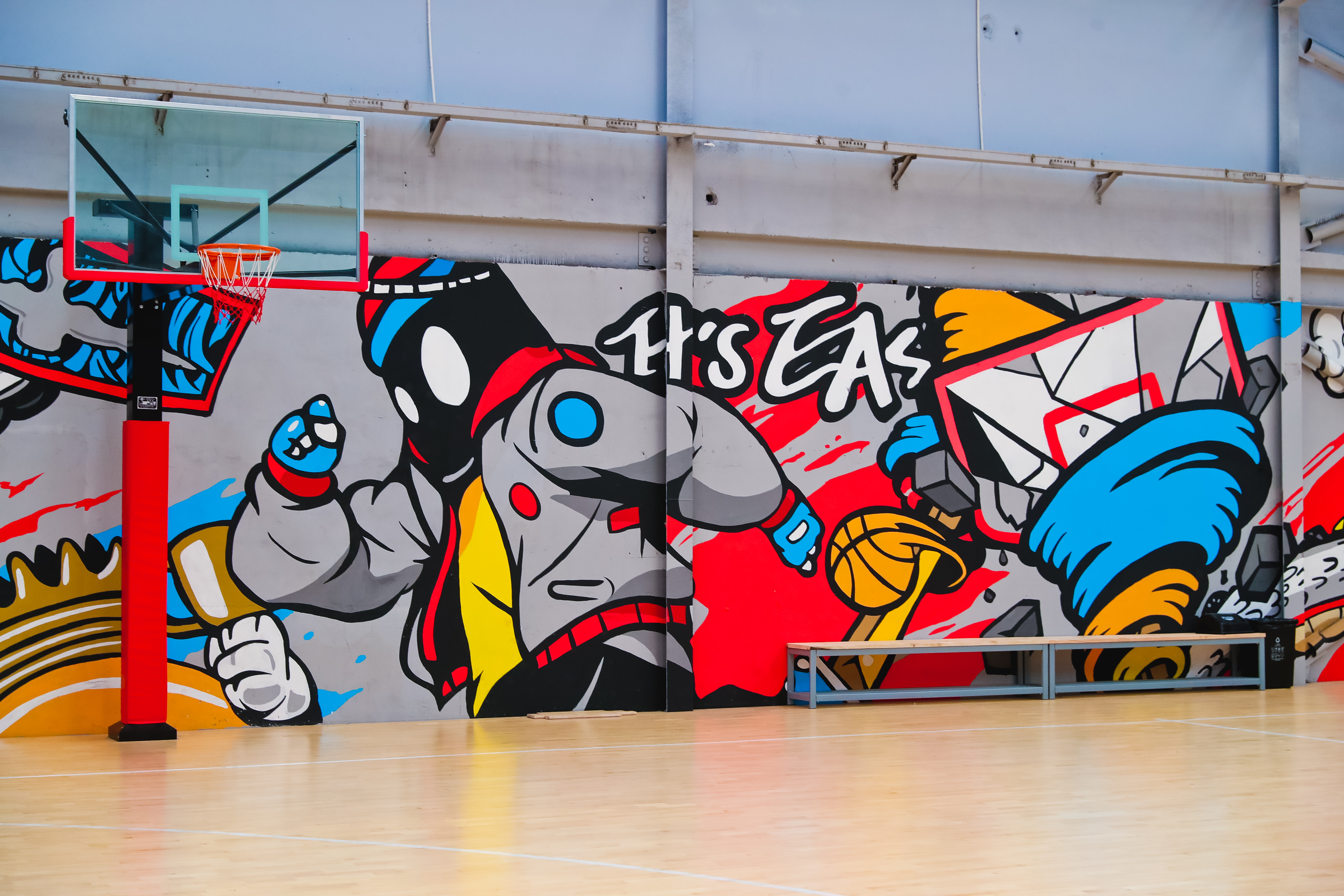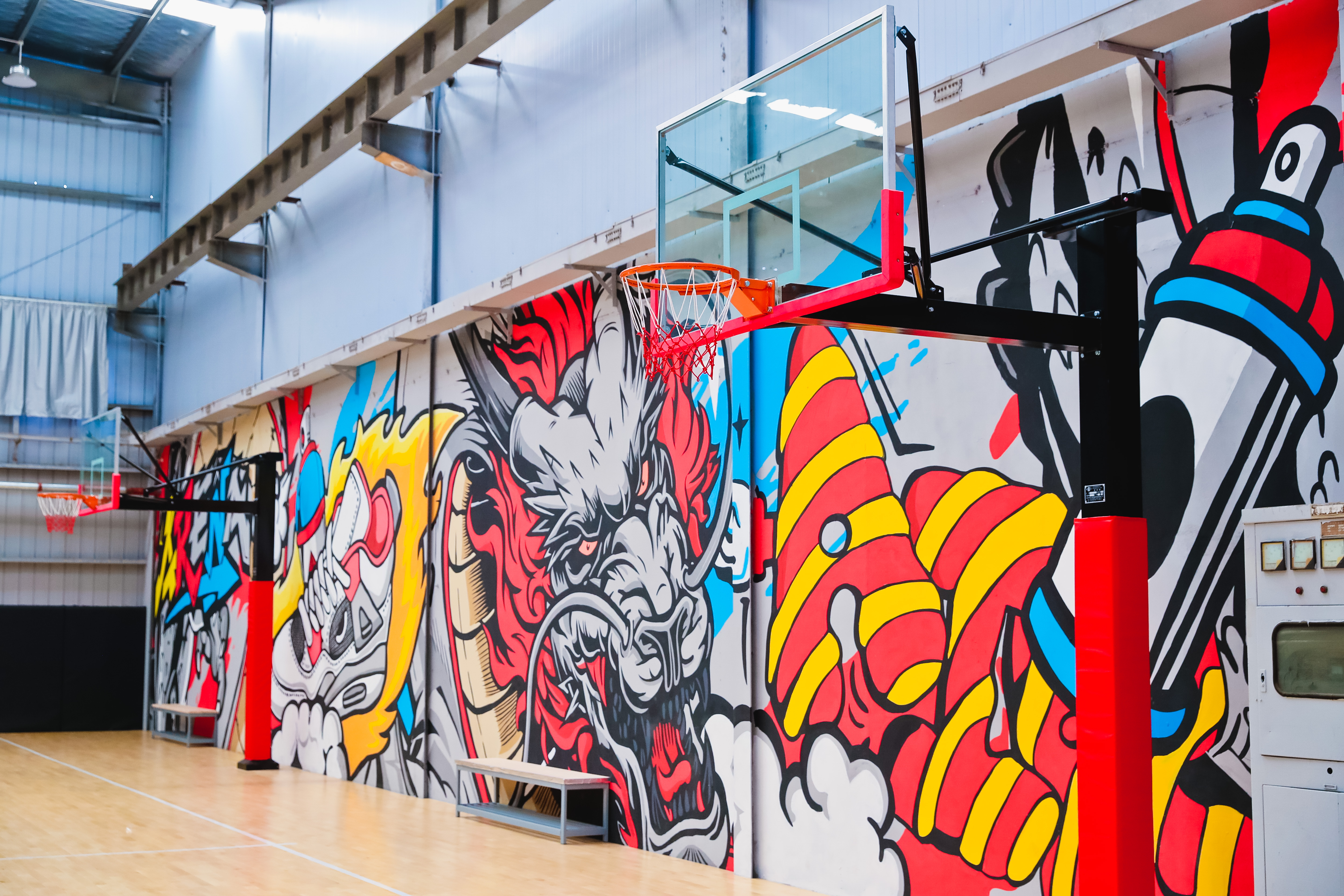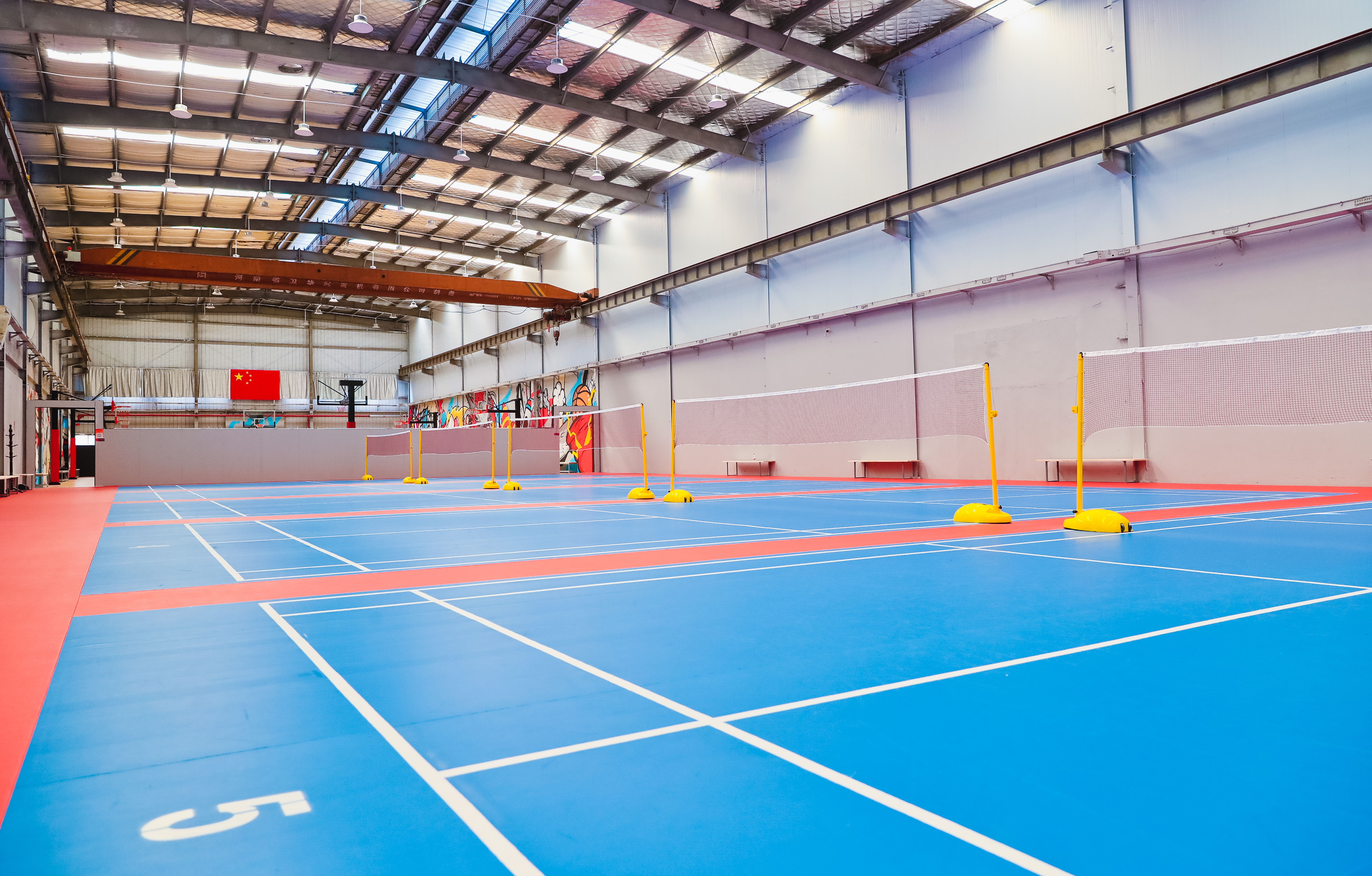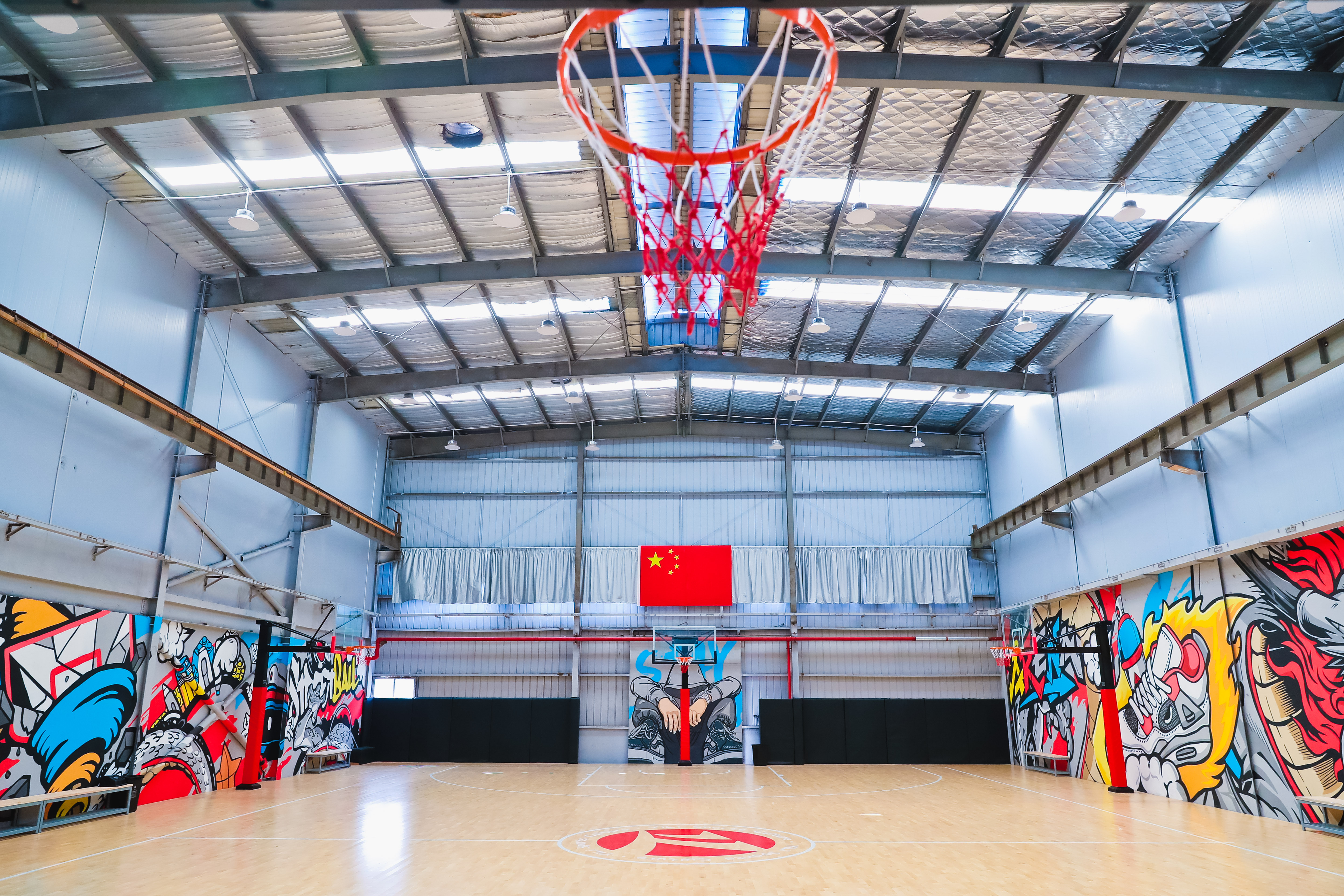 进门便是羽毛球场地,天蓝色的地面以实木运动地板加运动地胶合成,与常规铁皮厂房穹顶形成鲜明对比,场地南北向墙壁也均保留了铁皮厂房的“原汁原味”。这样的标准化羽毛球场地共有9片,全部栖身于铁皮厂房内,放眼望去一览无余。羽毛球场地旁边大约70平方米的空间是乒乓球操练场。再往里走便是标准化篮球场,不同于羽毛球场地与乒乓球场地的简洁,篮球场地外缘的挡板全部饰以新潮动漫彩绘,地板是显见的实木运动地板。酷爱篮球的吴世龙说:“激情与速度在这里上演再合适不过。”