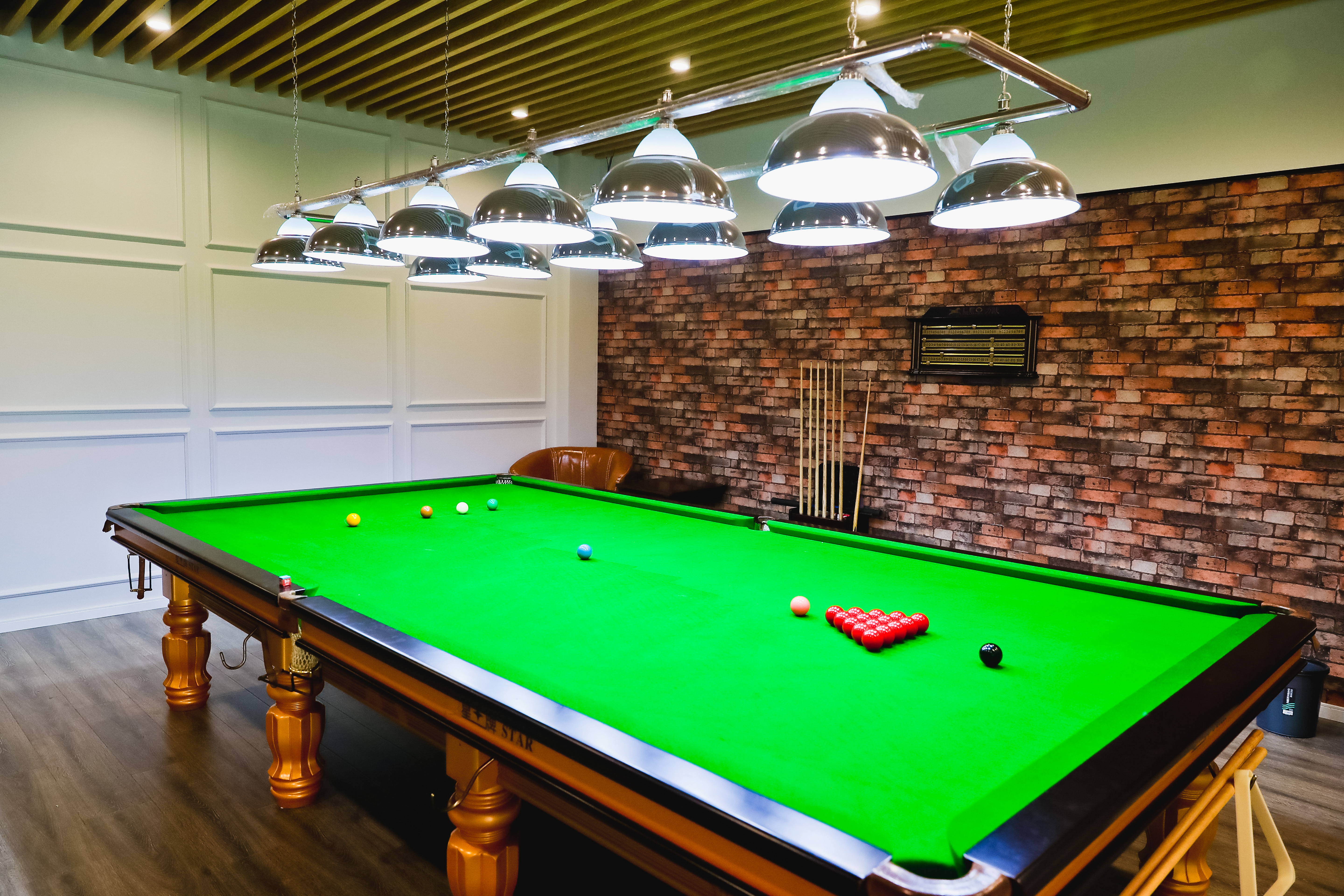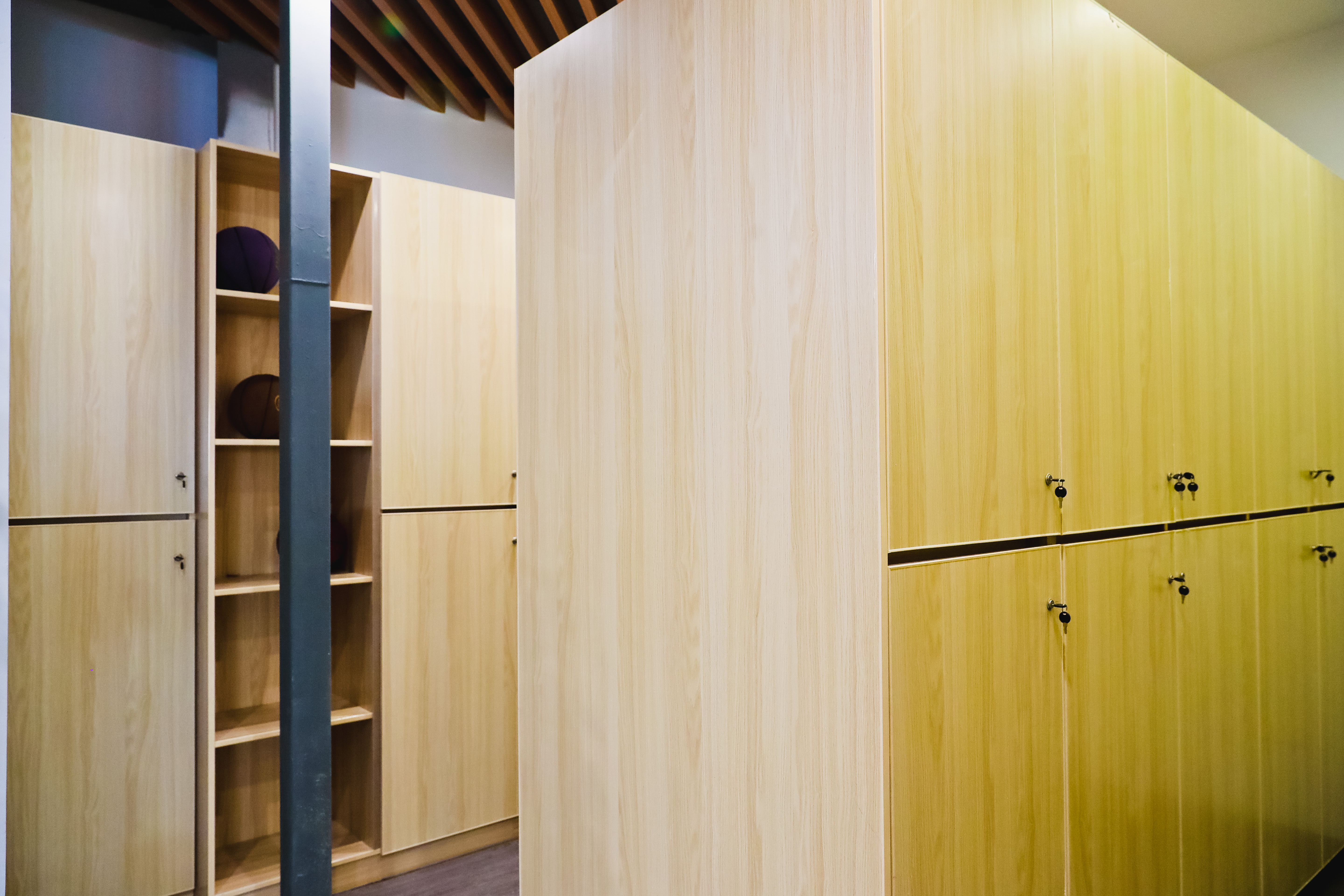 场馆东侧的休息区则给人别有洞天之感。门口的展示架上陈列着各种收藏版的球衣、球鞋等。占地面积400平方米的空间内,分布着淋浴间、卫生间、储物间、运动装备供应区,靠窗的区域还设置了儿童游乐区。运动馆保留了原先的楼梯,拾级而上来到二楼,斯诺克球房和茶室闯入眼帘。