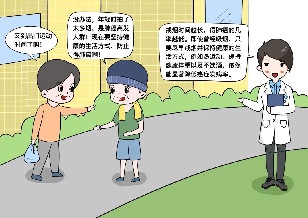 事实上,戒烟时间越长,得肺癌的概率越低。即使曾经吸烟,只要尽早戒烟并保持健康的生活方式,例如多运动、保持健康体重以及不饮酒,依然能显著降低癌症发病率。有研究表明,保持规律运动习惯的人,患肺癌的概率较低。