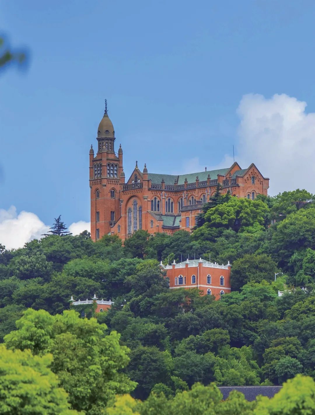 佘山山顶教堂 位于西佘山顶部,是上海市文物保护单位。原为希腊十字平面的小堂,由天主教耶稣会传教士建于清同治十二年(1873)。1925年拆除小堂,历时十年重建大堂。外墙红砖,屋脊高耸,钟塔上的穹顶呈橄榄形,外表华丽壮观。大殿东西长56米,南北宽25米。建筑平面改为拉丁式十字形。钟塔高38米,琉璃瓦屋脊高22米,殿内拱顶高17米,设座位3000个。