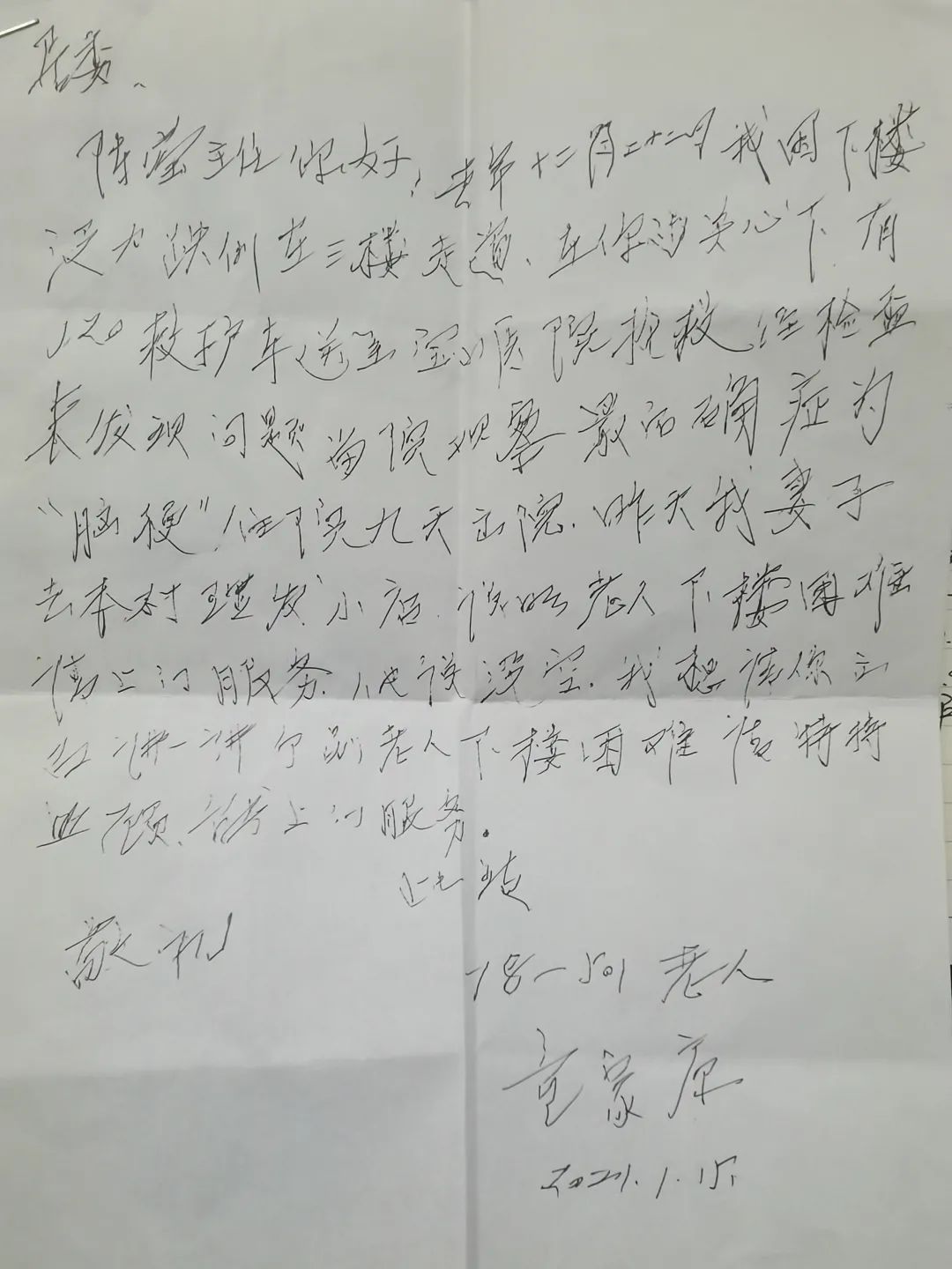 近日,宝钢二村93岁高龄的童师傅给社区居委手写了一封求助信,表述了自己行动不便,面临“理发难”的情况,希望能帮忙协调,请理发师上门。