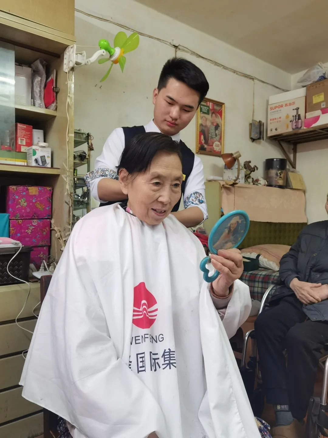 当老人看到理发志愿者专程上门,免费为自己理发,都十分高兴。在家人的搀扶下,行动不便的老人在椅子上坐好,志愿者与老人沟通后,剪了每位老人想要的发型。陈阿姨照着镜子看着新发型非常满意,连声赞叹。