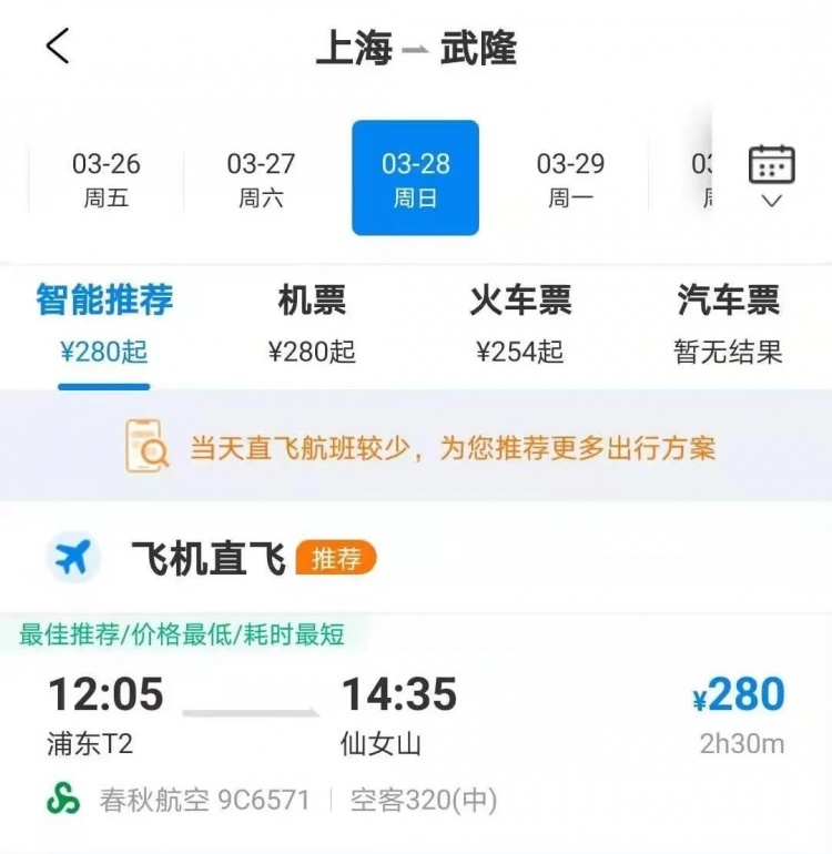 据悉,该航线由春秋航空执飞,每周飞行4班,班期为周一、周三、周五、周日,去程航班号为9C6571,12点05分从上海浦东机场起飞,14点35分降落武隆仙女山机场;回程航班号为9C6572,19点45分从武隆仙女山机场起飞返回上海浦东机场,到达上海的时间是晚上22点。目前,各大售票平台及春秋航空APP已开放购票通道,航线开通初期,价格也有较大的优惠。