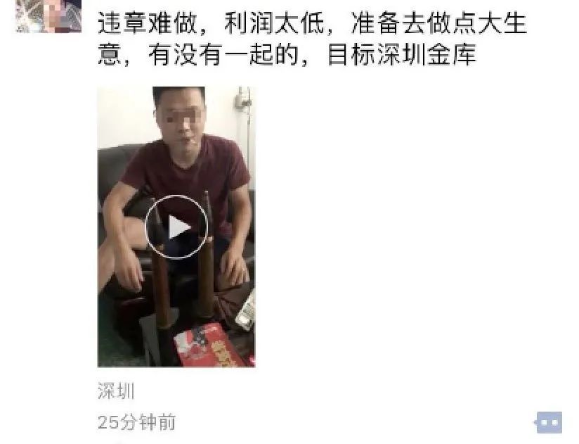 2018年,深圳网警收到网民举报:一名网友在微信朋友圈发布视频,手持形似穿甲弹的危险物品,扬言要打劫深圳金库,并配文字询问“有没有一起的”。