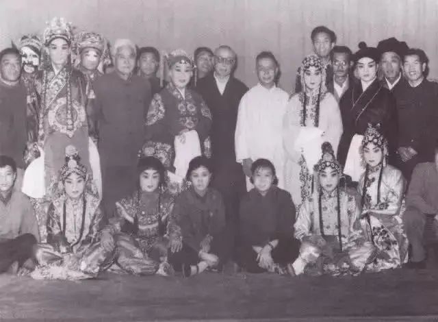 1962年,粟裕(站立者右七)和田汉(站立者右八)观看河南安阳市豫剧团演出《对花枪》后,上台祝贺并与演员合影