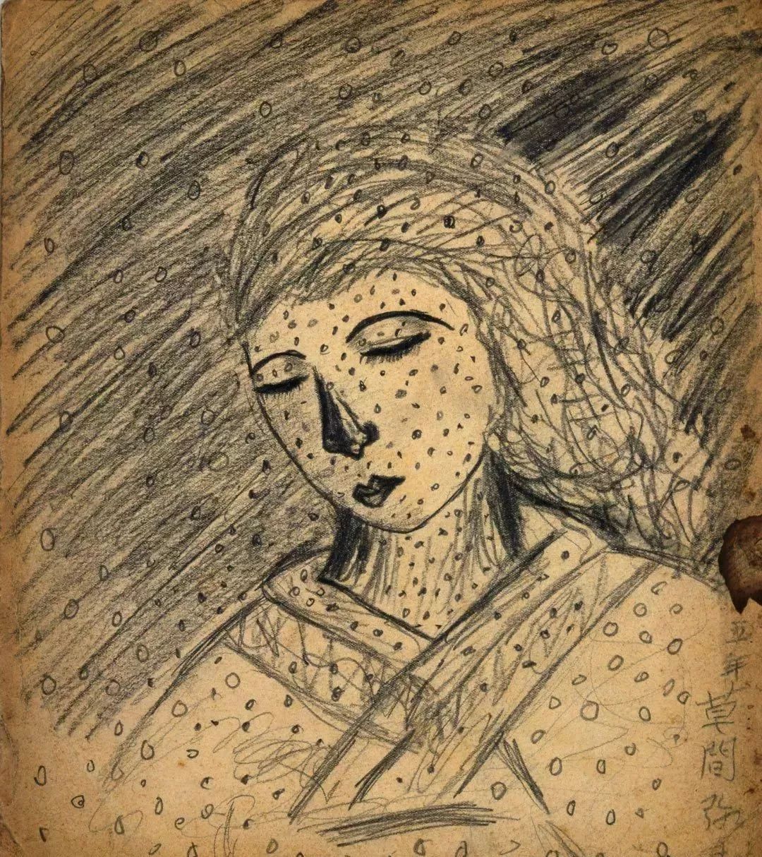 也是在这一年,草间用铅笔画了一幅母亲肖像,画中的圆点就是她看到的“真实景象”。在当时,这个孩子并不清楚自己与他人的不同,她天真的以为所有人都是如此。