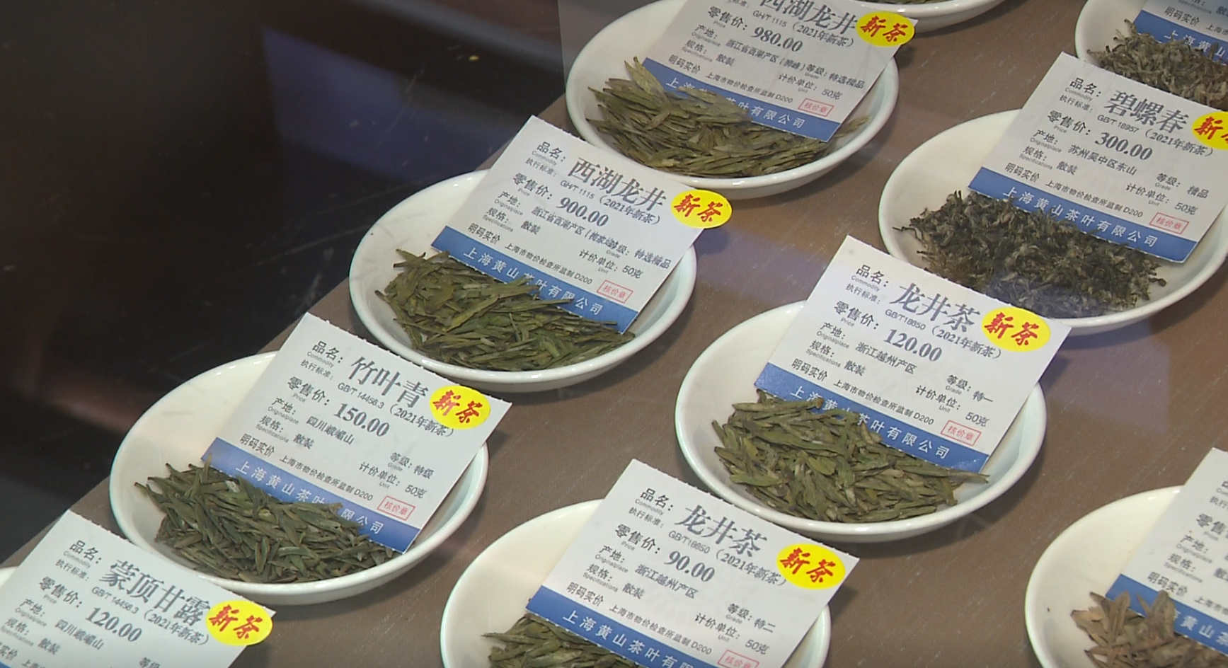 今天上午记者在淮海路上的老字号上海黄山茶叶公司叙友茶庄淮海店看到,新茶字样已经醒目标出,展示柜上成列着来自西湖龙井产区的西湖龙井、狮峰龙井,以及云南普洱的毛峰、四川峨眉山的竹叶青等春茶,不时有市民前来打探新茶的相关信息。