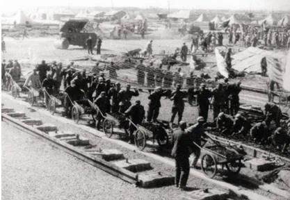 ▲推小车、抬钢筋、筑地坪,远处可见部队宿营的帐蓬