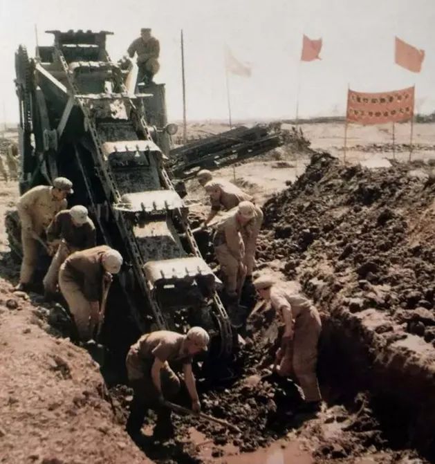 ▲机场施工地区地势低洼,地下水位高,任务艰巨。施工部队采取大面积平行流水作业,分段施工,逐段完成