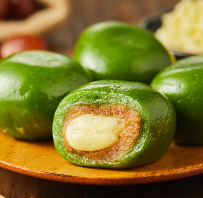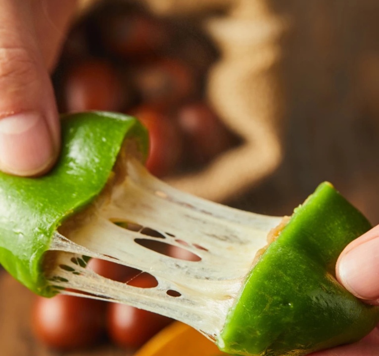 这款青团的栗蓉,与盒马热卖的花花栗子同源,选取的都是肉质细腻、甘甜芳香的迁西板栗。青团软软糯糯的翠绿“外衣”下,是香糯清甜的板栗蓉,搭配醇正的马苏里拉芝士,甜而不腻,还能拉丝,一定会是甜口爱好者的首选。