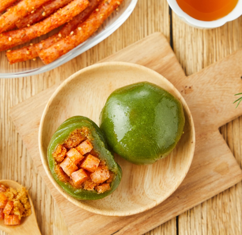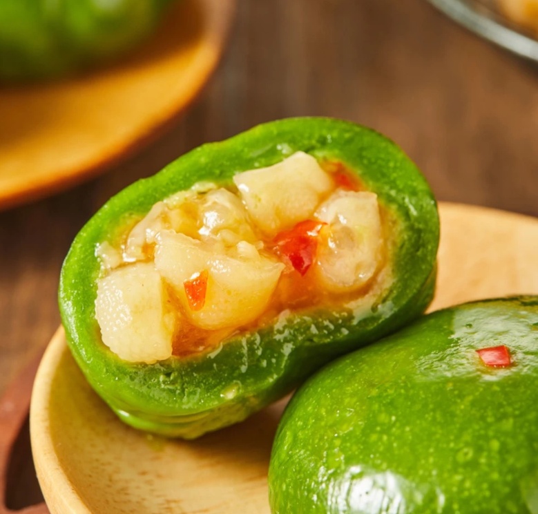 辣条肉松青团里,略有嚼劲的“网红零食”辣条加入咸香交织的蛋黄和肉松,咀嚼间丝丝流油,口感奇妙,爱尝鲜的“吃货”不要错过。