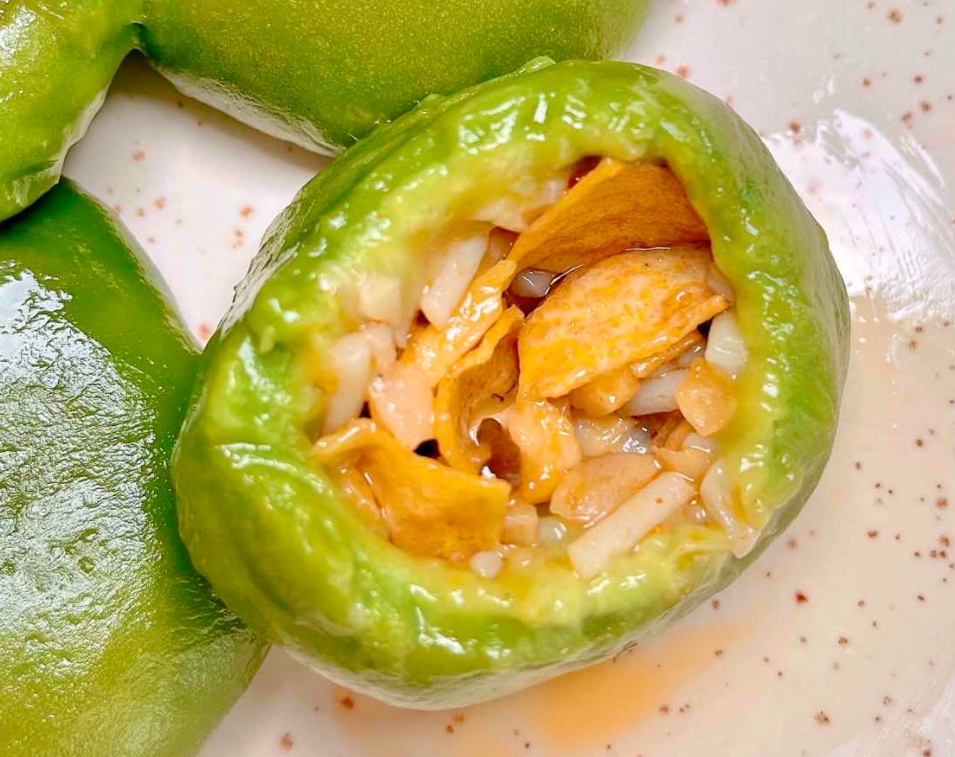 螺蛳粉青团从外表看,青翠油亮的外皮与普通青团别无两样,实则内有乾坤——馅料里包含酸笋、米粉、豆角等螺蛳粉“标配”食材,精心调制的辣椒油红润透亮,咬一口,汤汁浓郁,香辣回味。