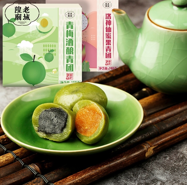 “老字号”线下青团销售火热,线上也动足脑筋推陈出新。在老城隍庙旗舰店的网店页面,新上市的青梅酒酿青团和洛神蜜果春味青团,无论是名称还是包装都十分吸睛。