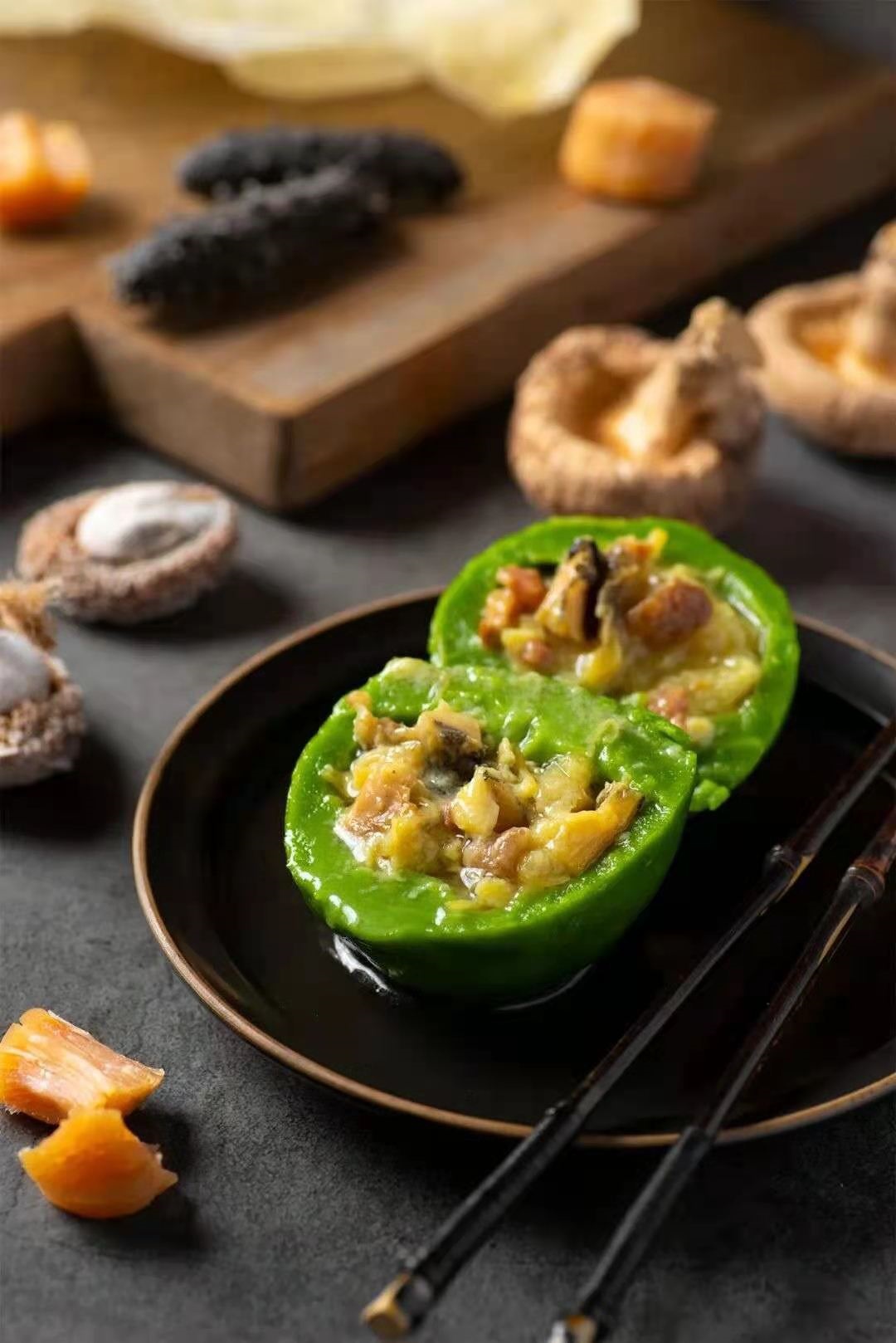 一只佛跳墙青团的用料,包含了鲍鱼、海参、大瑶柱、花胶、花菇、火腿等食材,与菜品完全一致。为了让馅料锁住鲜美,鸡骨、排骨、火腿等要熬制一天一夜,与海参、鲍鱼、鱼肚、火腿等预处理并切丁的食材混合,冷冻成半凝固状的馅料。这样蒸熟后的佛跳墙青团,一口咬下去,皮、馅分明,鲜味十足。目前,佛跳墙青团每天限量供应五六百只,已经有点供不应求,正逐步提高产量。