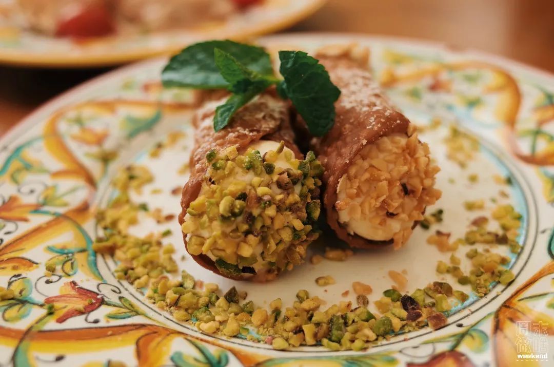 西西里奶油卷也值得一点,酥炸的卷皮包裹意大利乳清干酪柠檬慕斯,再滚上开心果碎和榛子碎,有种既清爽又浓郁的焦糖奶油香气,两人分食一份即可。