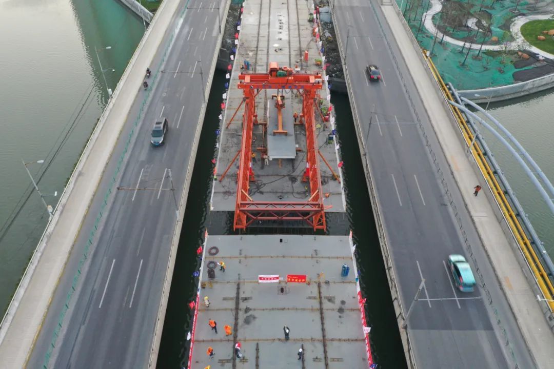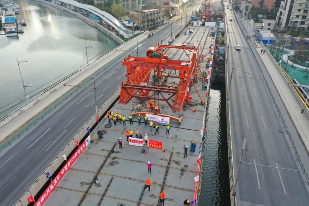 新建长寿路桥中桥体量虽小,但地处城市主干道,苏州河河道在此呈现锐角转弯,中桥夹在南北两幅边桥之中,浮吊无法进入,能够利用的施工场地极其狭小,传统的吊装方案和设备难以满足现有实际工况施工。为在施工期间不占用两侧边桥路面,尽最大可能减少施工对交通通行的影响,施工人员因地制宜、合理安排,并自主研发设计了大型专用设备——QMD50T桥面吊。